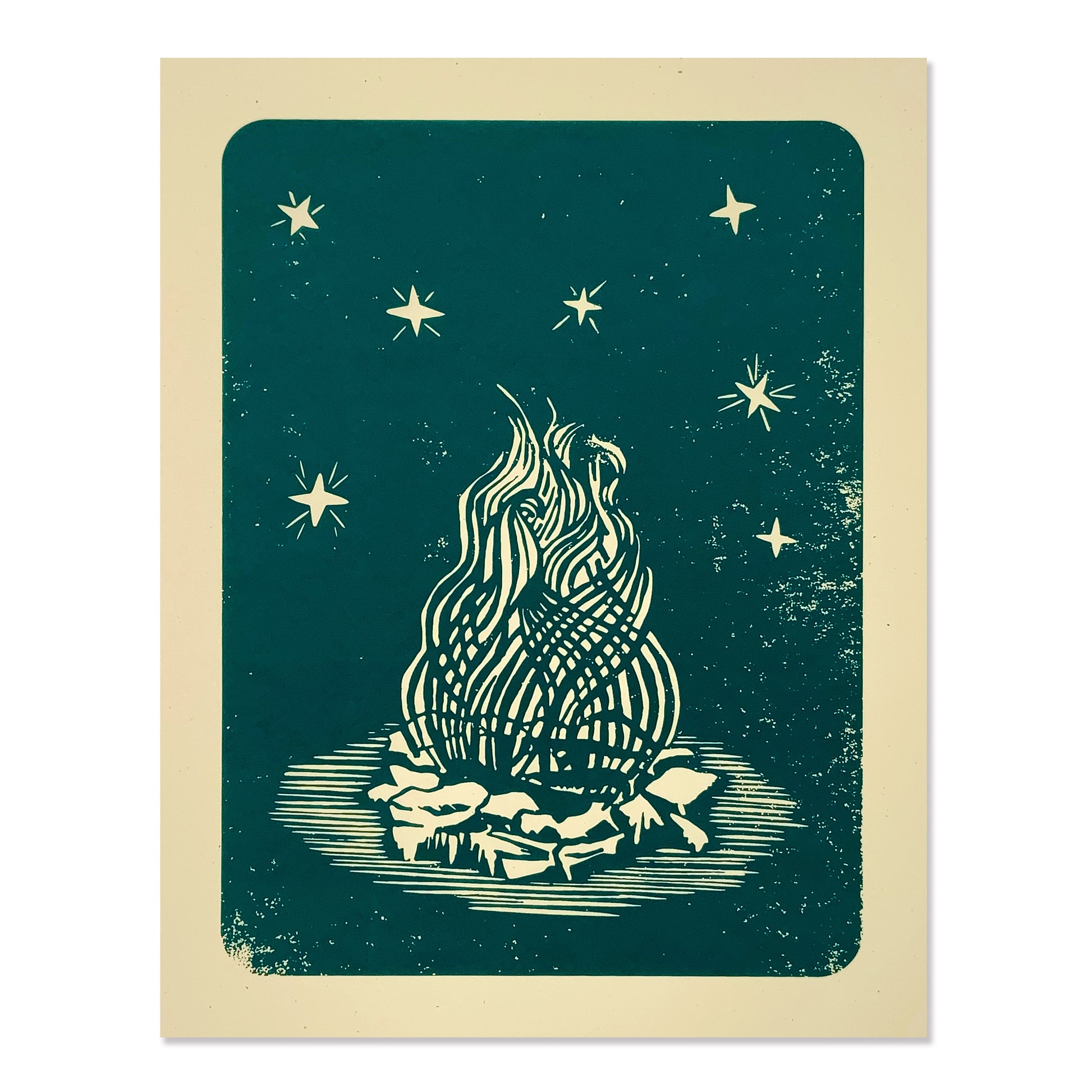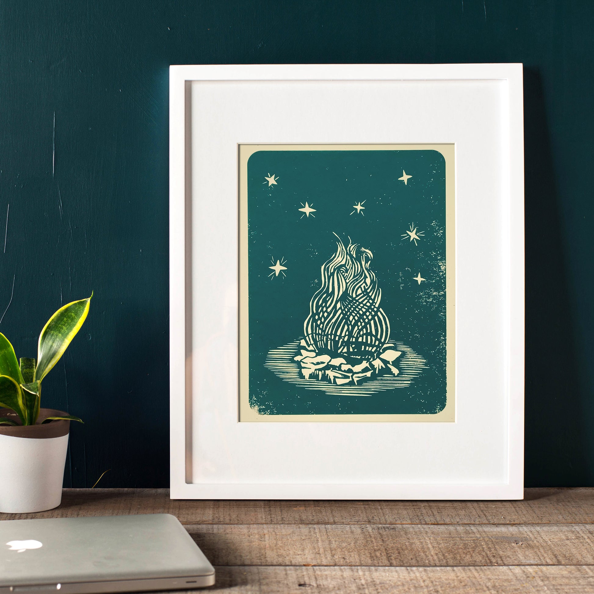 Welcome some outdoor adventure into your home with this unique and playful Campfire Screenprint! Featuring a cozy, handprinted glow sure to warm up any space, you'll be adding a unique charm that's sure to keep your friends, family, and guests gathered around.