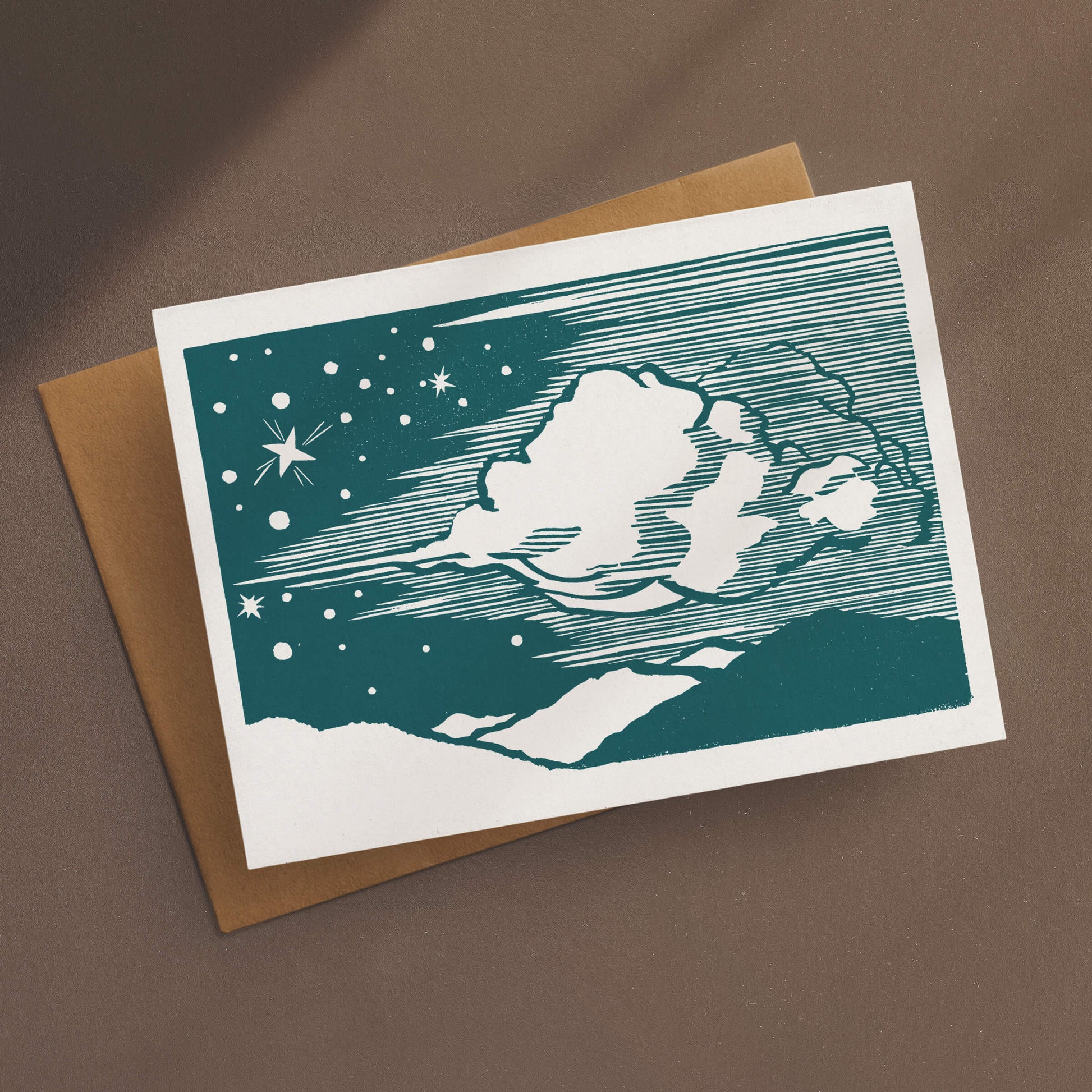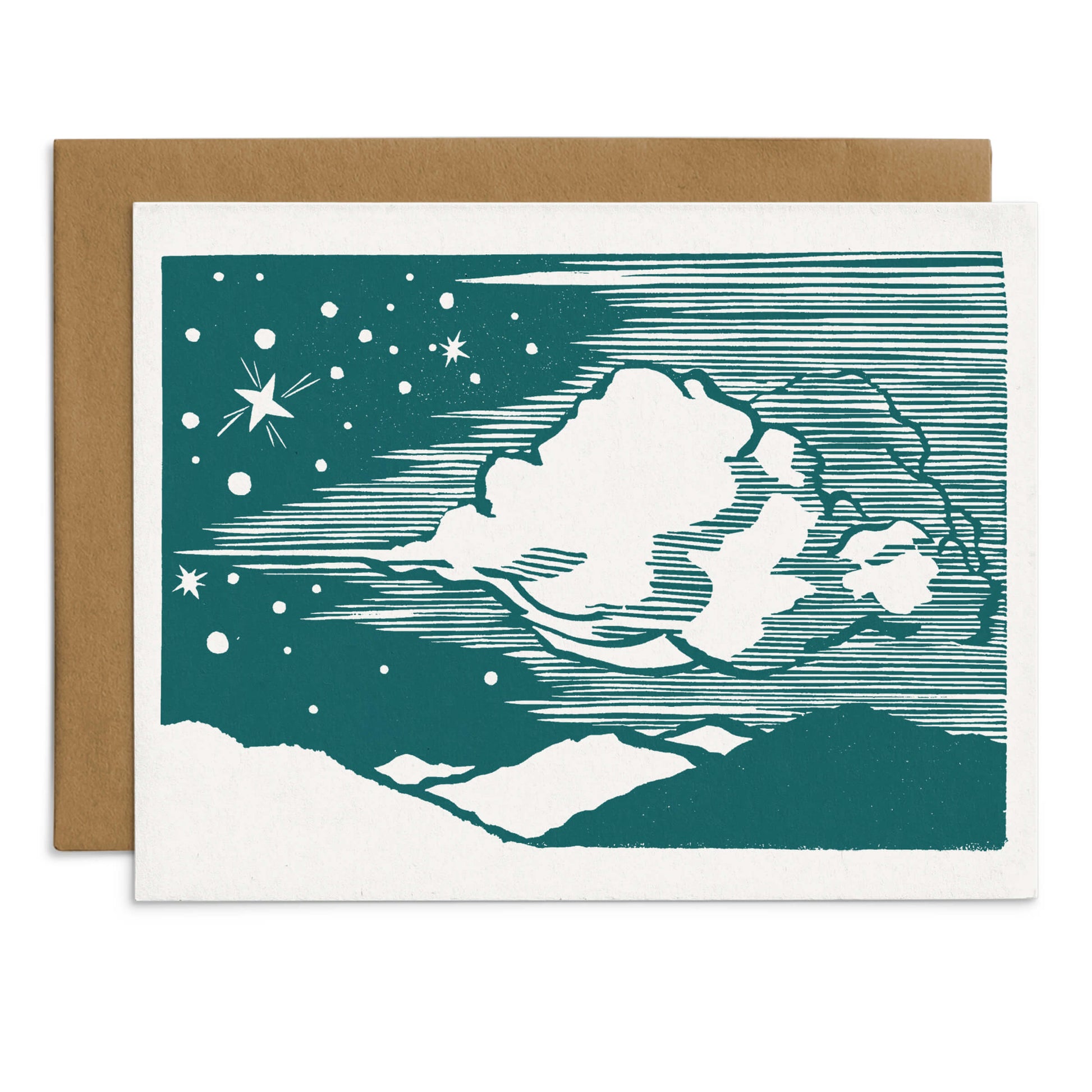 Send a little piece of nighttime magic to brighten someone's day! The dreamy Clear Skies greeting card from Starfangled Press captures a quiet moment under a starry mountain sky. The design features soft white clouds drifting past the glowing stars, all set against a deep blue night sky.