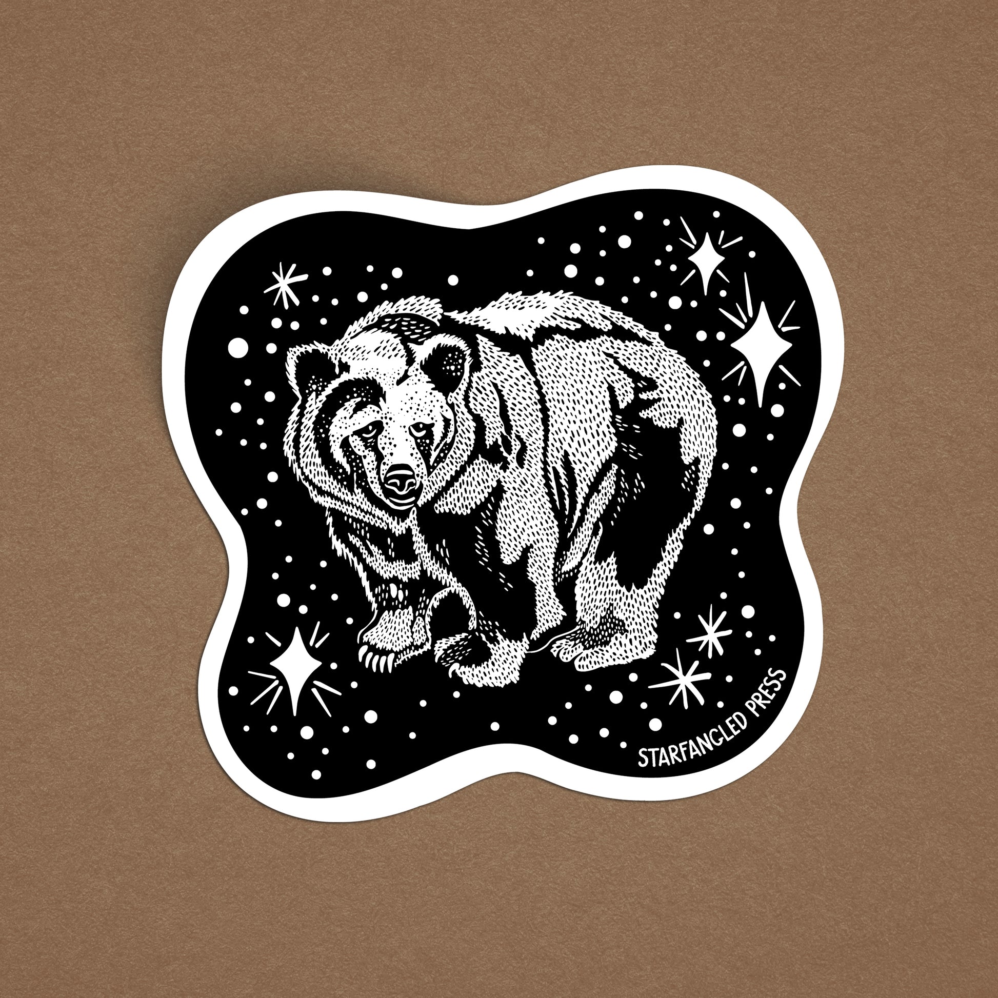 Cosmic Bear is a 3" vinyl sticker from the Starfangled Press Cosmic Critters series. The rich, black-and-white graphic features a majestic black bear standing amidst a vast night sky surrounded by a constellation of stars.