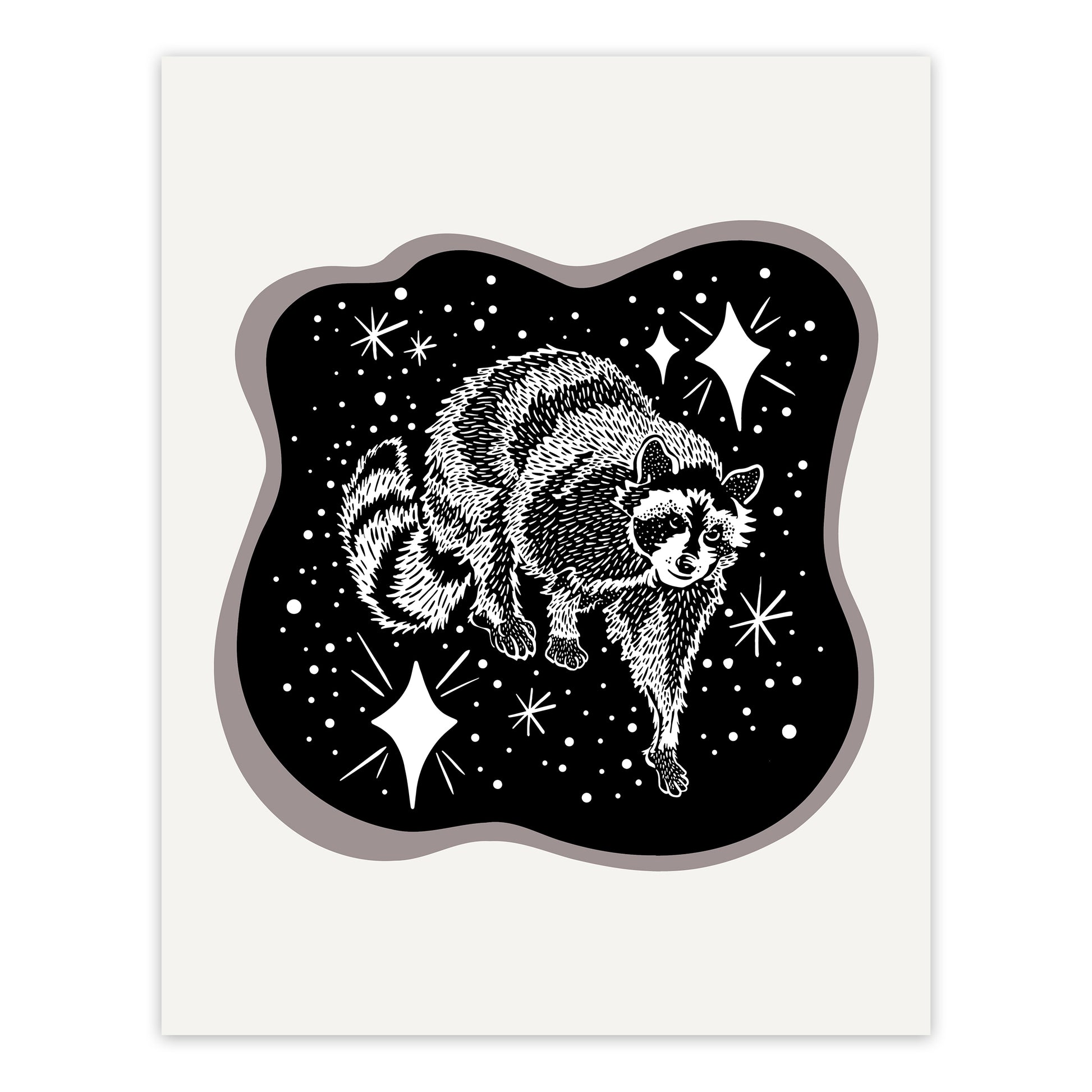 It features a mischievous raccoon amidst a vast night sky surrounded by a constellation of stars. With a casual drawing style that is playful yet elegant, this print is perfect for any home or office space.