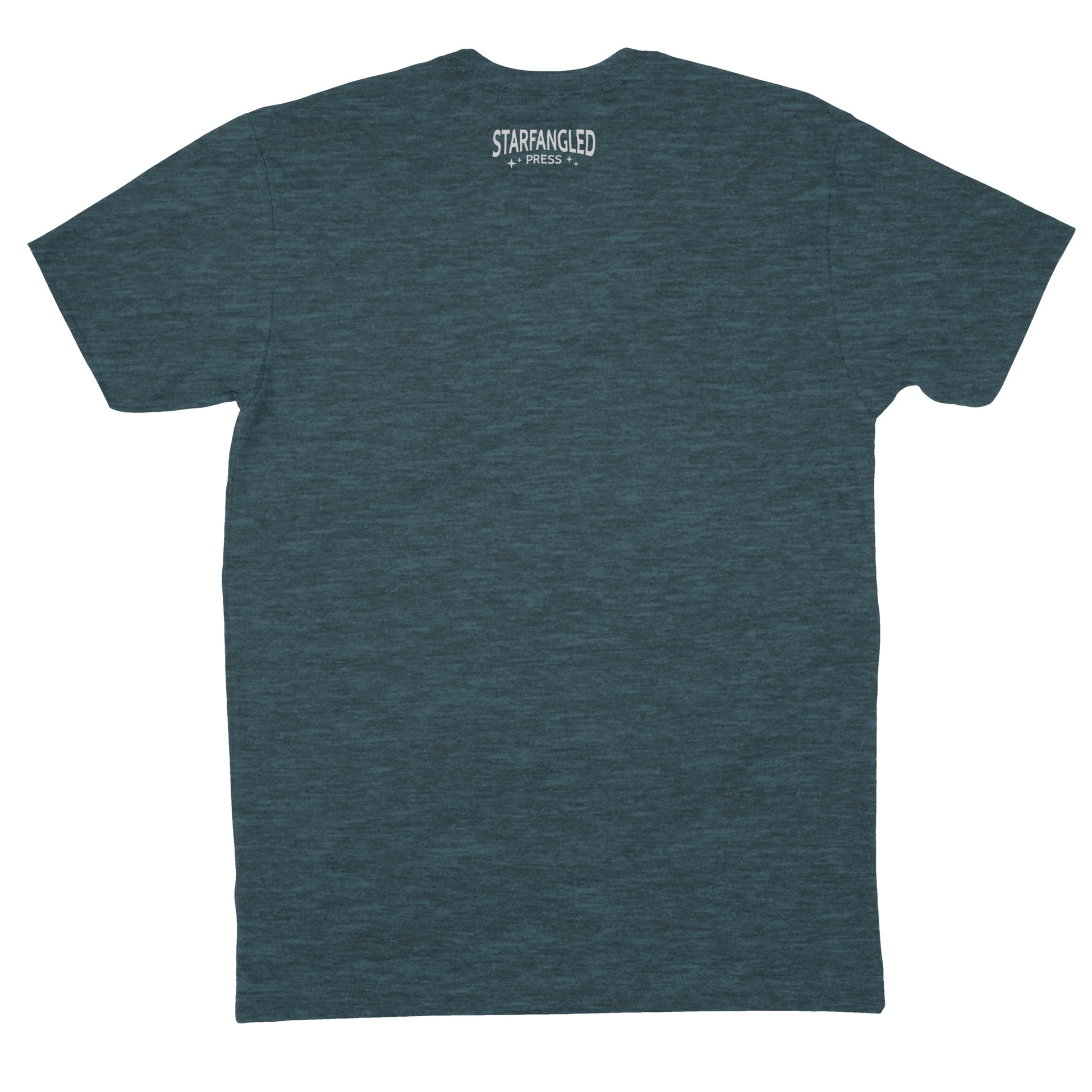 The image is screen printed by hand with subtly pearlescent white ink on a super soft, heathered indigo, classic fit crew-neck t-shirt.