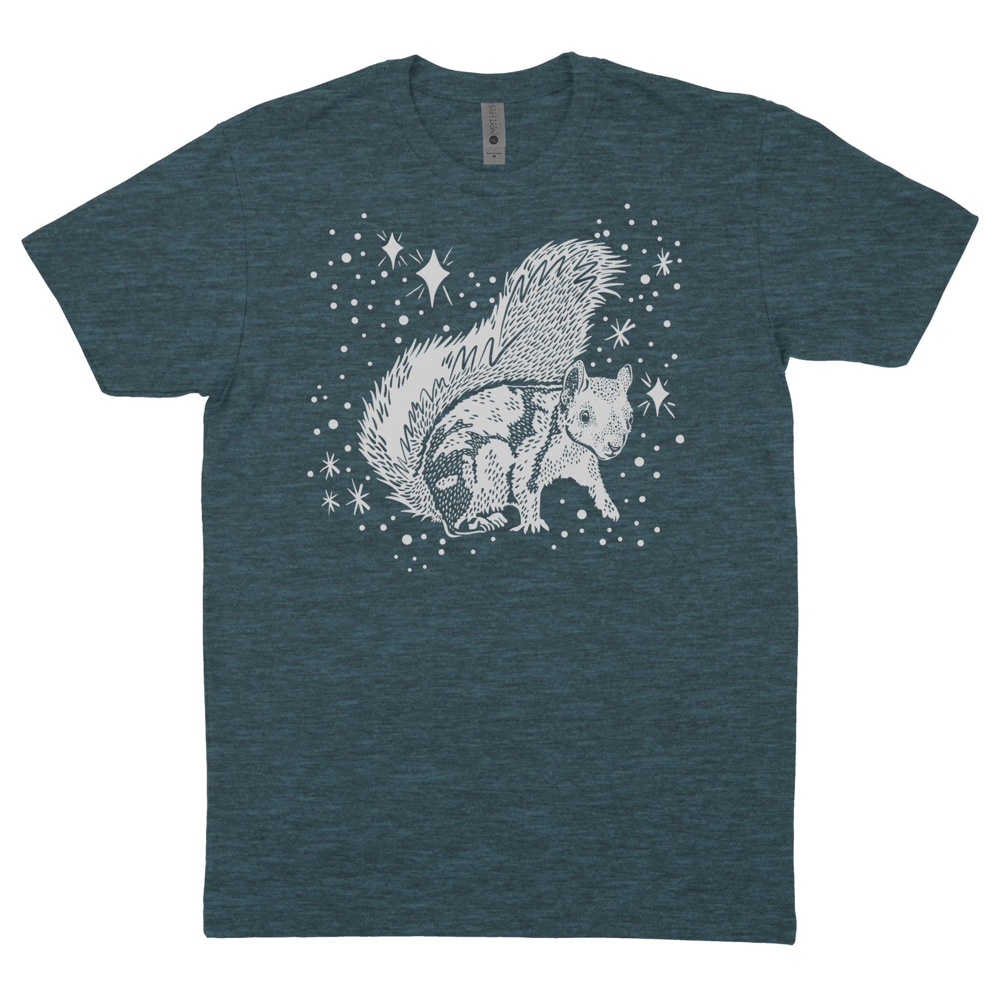 The Cosmic Squirrel is a hand-drawn, original design from the Starfangled Press Cosmic Critters series. With a casual drawing style that is a playful yet elegant reference to traditional woodcut prints, it features an energetic white squirrel standing amidst a vast night sky surrounded by a constellation of stars.