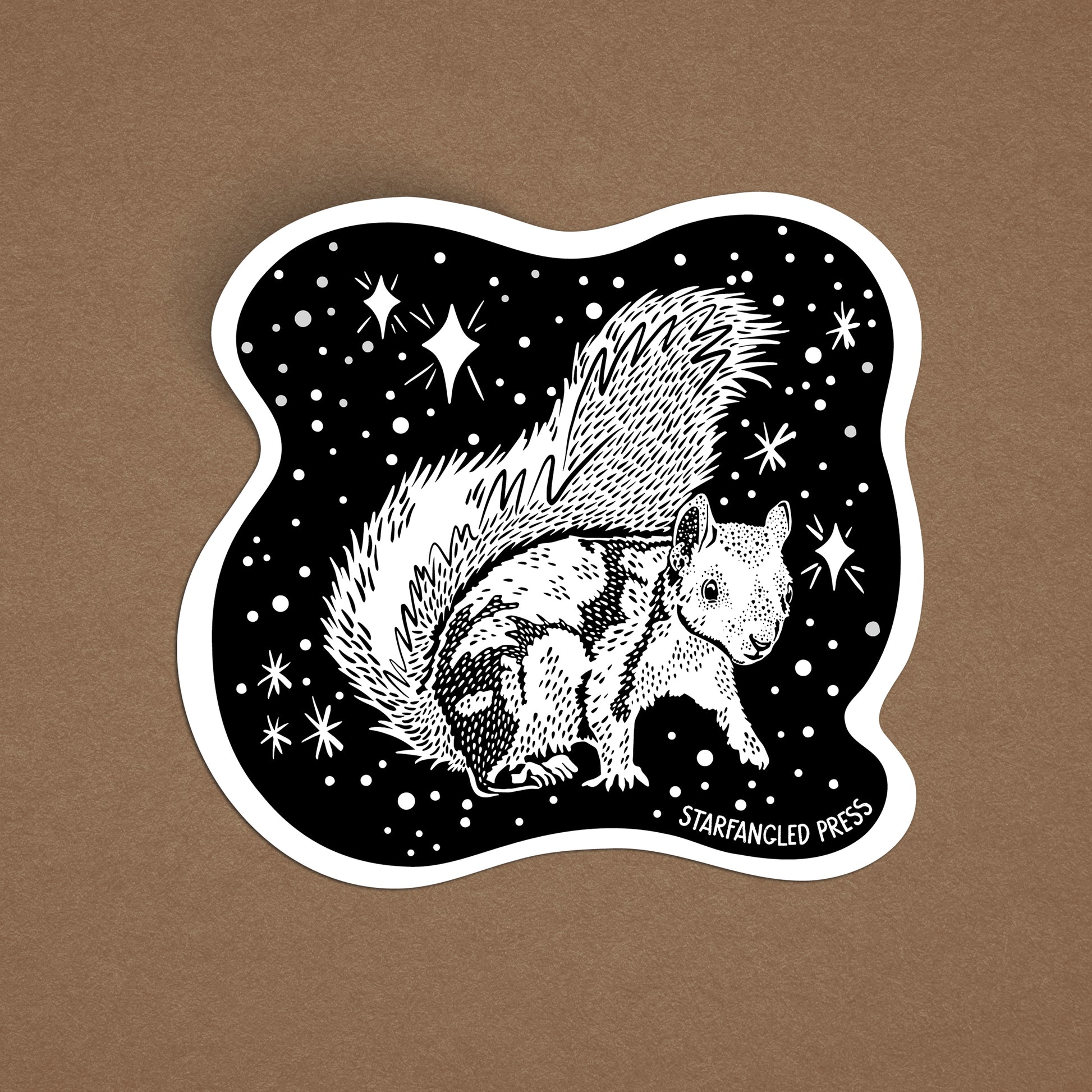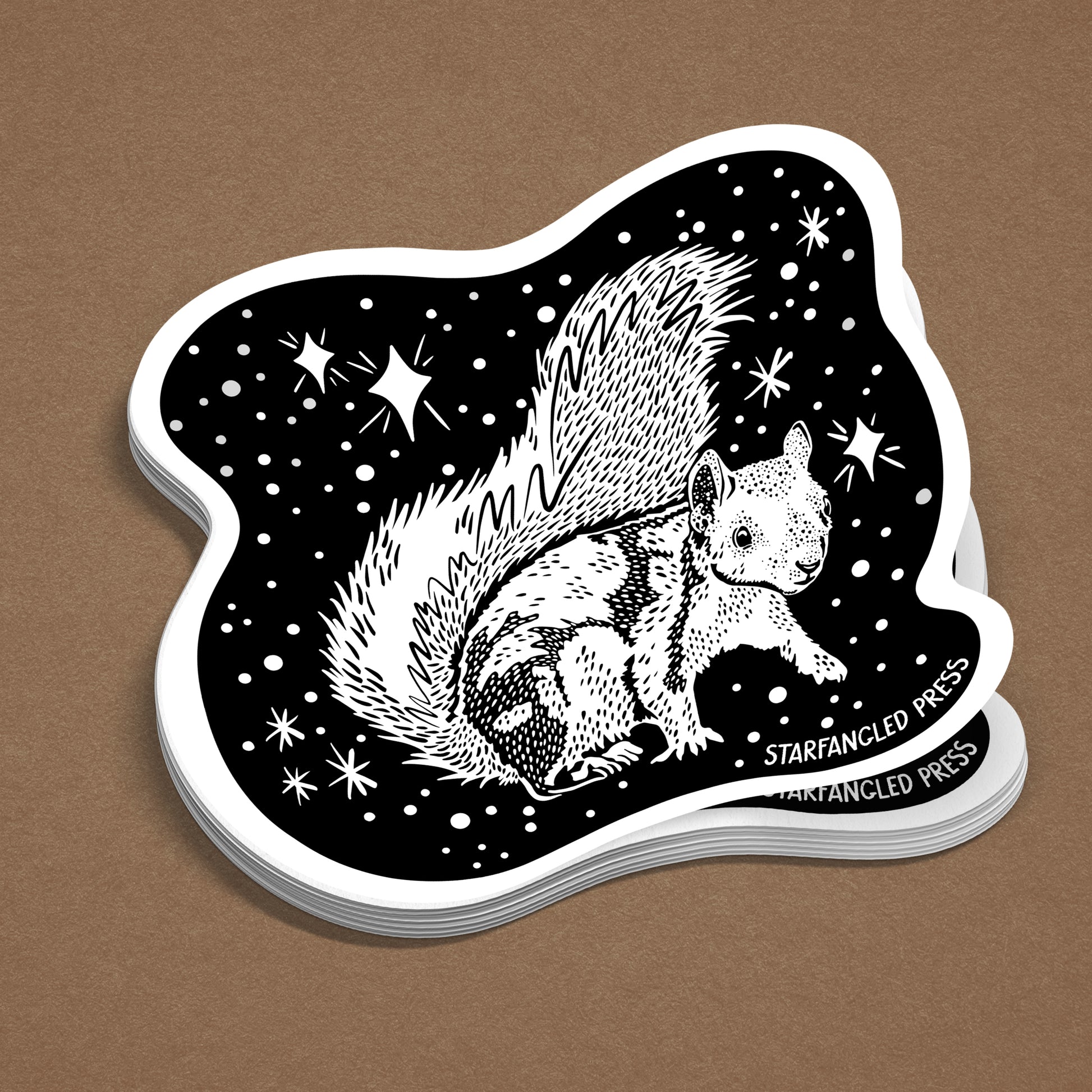 Cosmic White Squirrel is a 3" vinyl sticker from the Starfangled Press Cosmic Critters series. The rich, black-and-white graphic features an energetic white squirrel standing amidst a vast night sky surrounded by a constellation of stars.