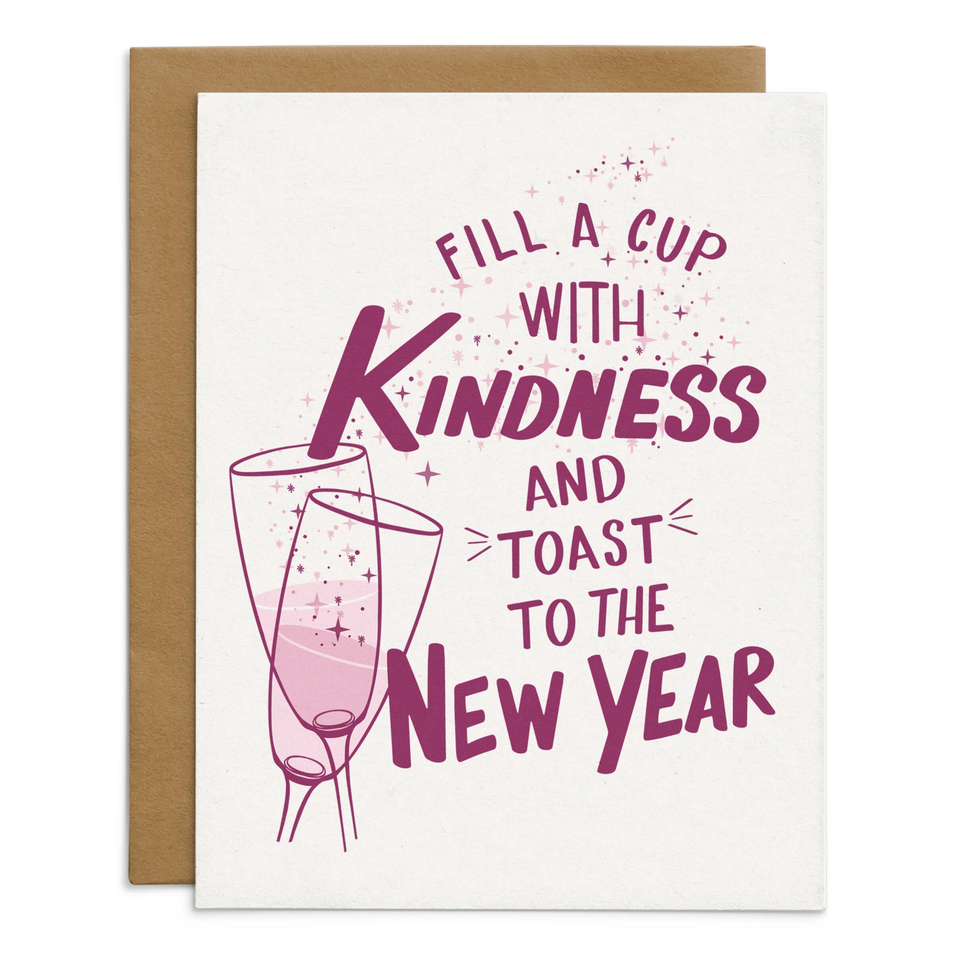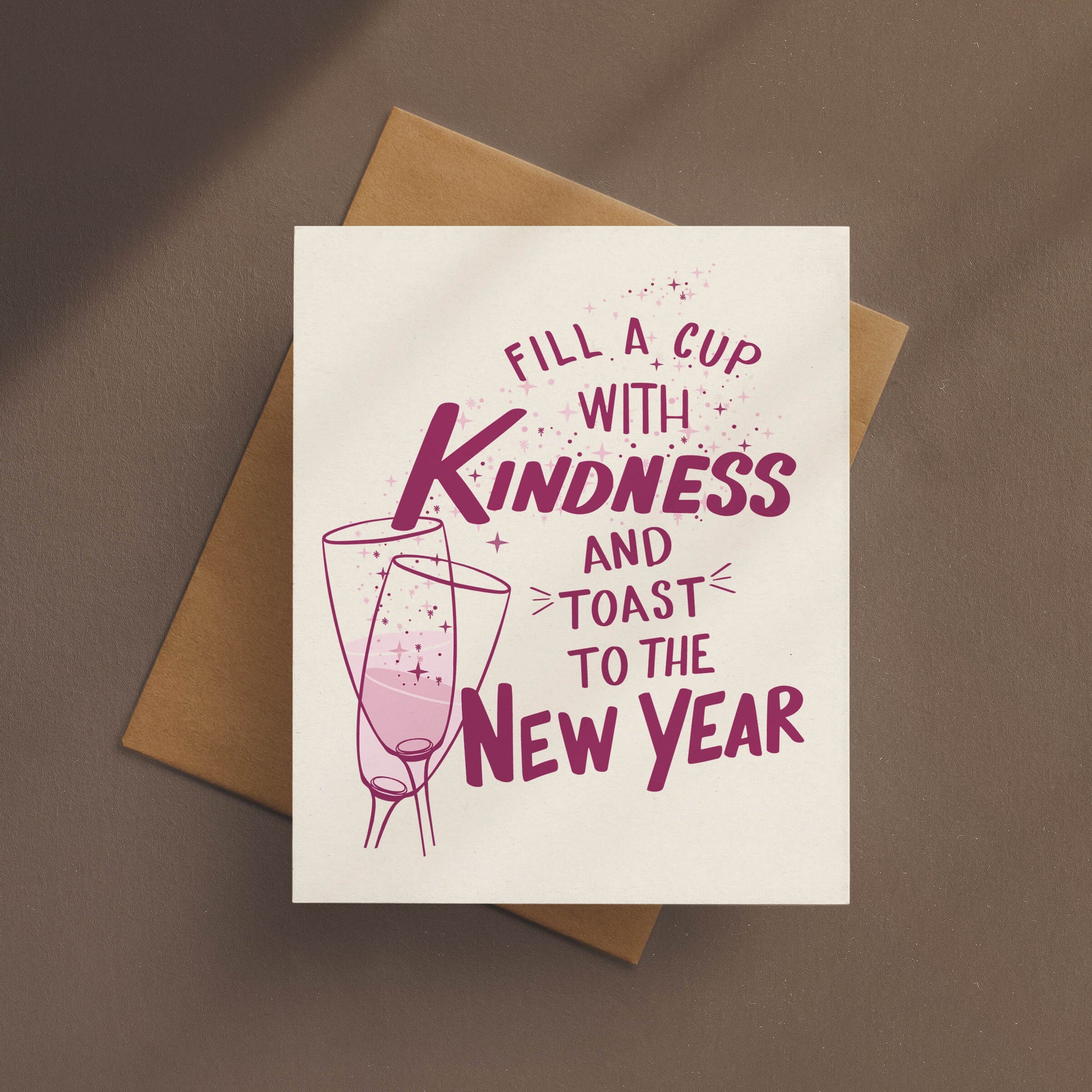 Raise a glass to the New Year with kindness! This festive card from Starfangled Press features an uplifting message to "Fill a cup with kindness and toast to the New Year," paired with playful illustrations of sparkling champagne flutes. Whether you’re wishing friends and family a fresh start or spreading some extra holiday cheer, this card brings a sweet, celebratory vibe to any New Year’s celebration. It’s a perfect way to toast the season with warmth and style.