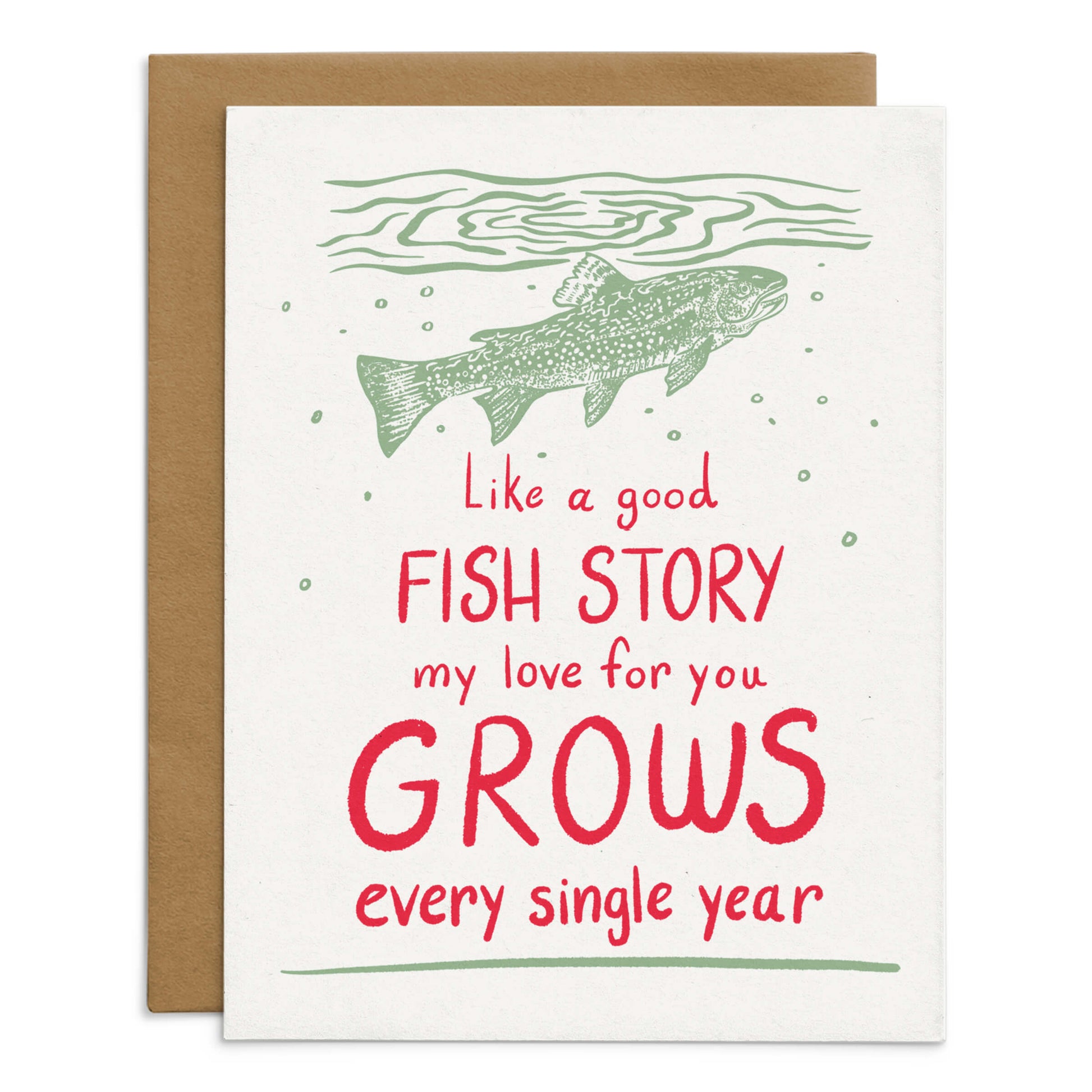 Celebrate your love with the Fish Story card from Starfangled Press, a fun twist on the classic "fish story" we all know. Just like those tales where the fish gets bigger with each telling, this card is the perfect way to tell your special someone that your love keeps growing stronger every year.