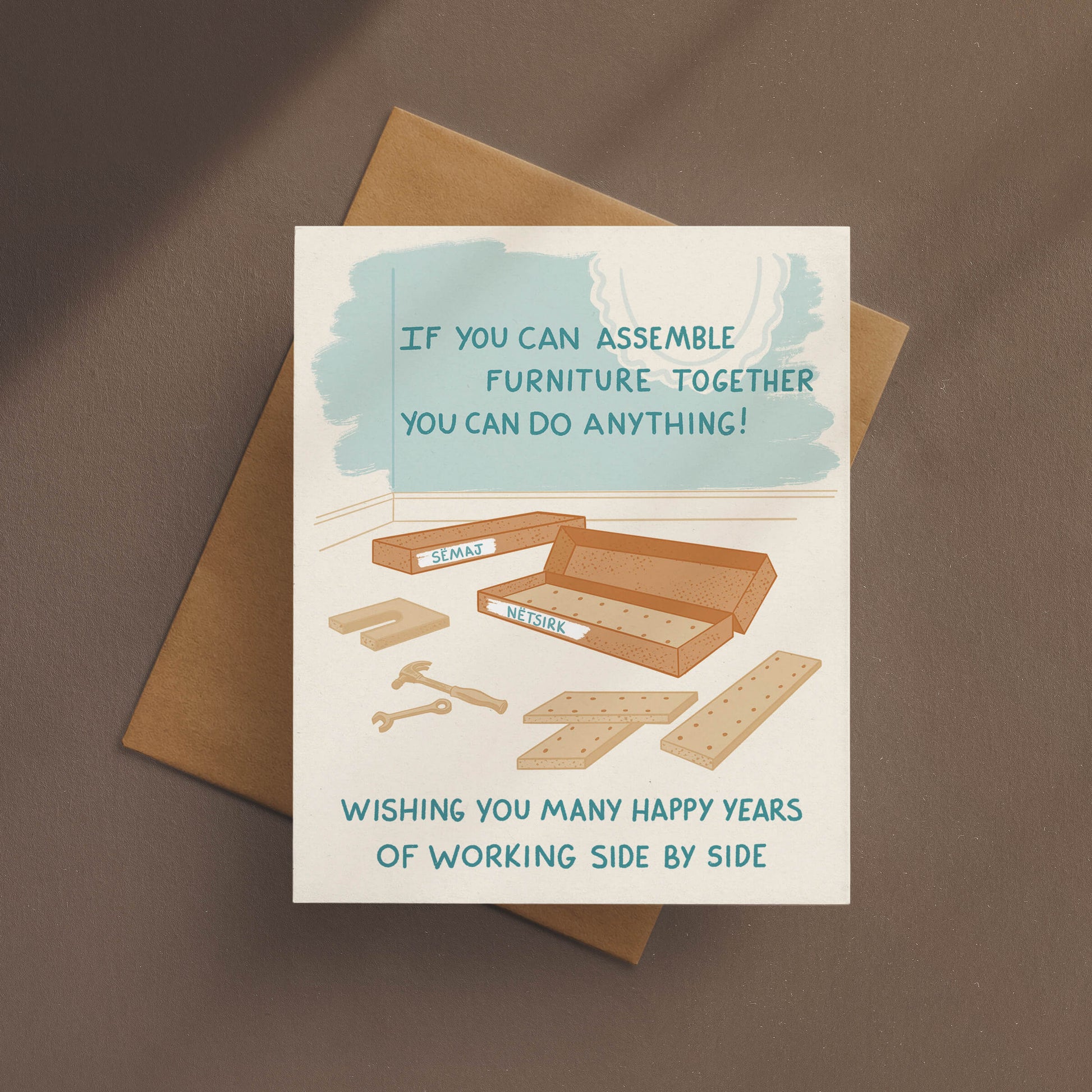 Congratulate the happy couple with this quirky Assemble Furniture card from Starfangled Press! Perfect for the couple who loves a good challenge and knows the value of teamwork.