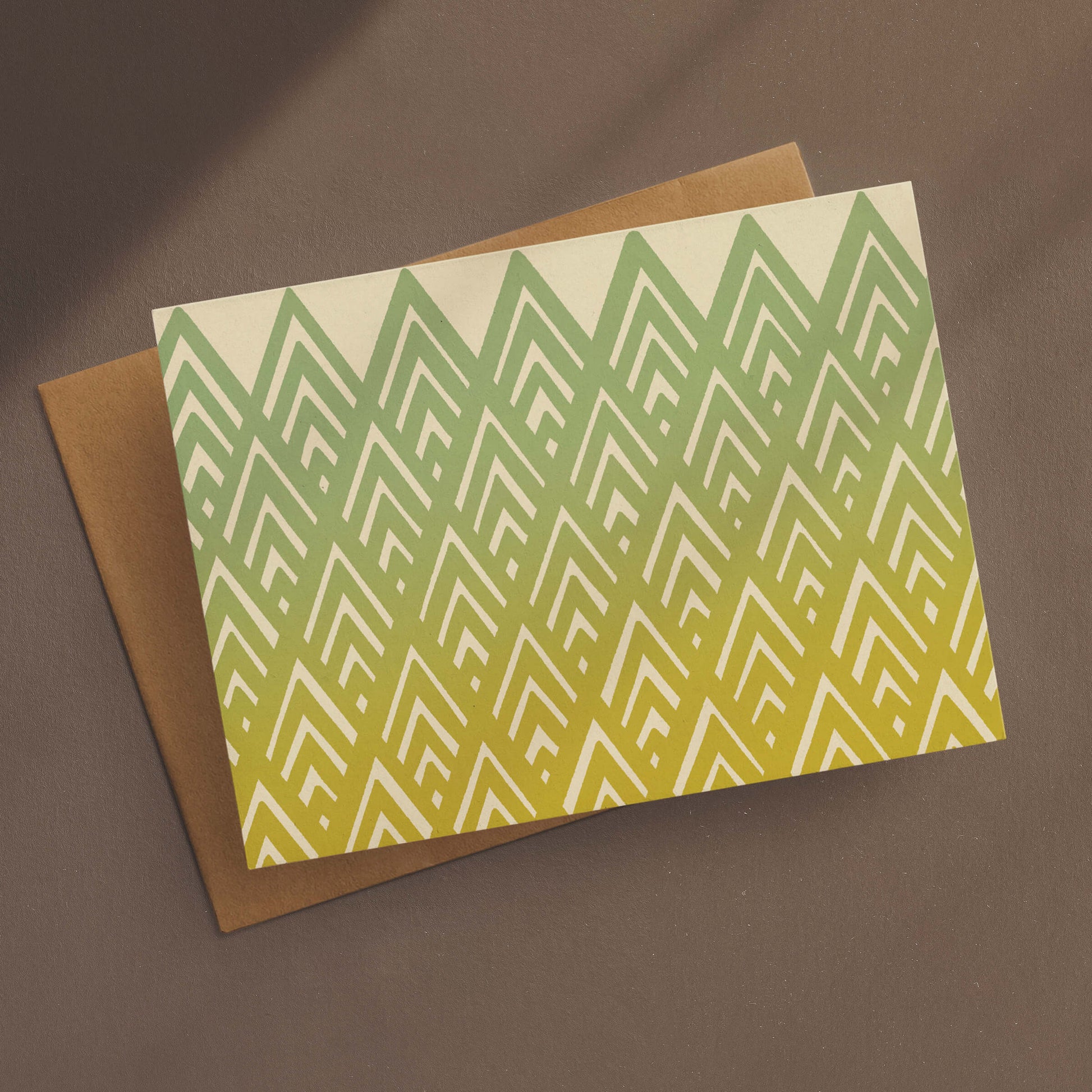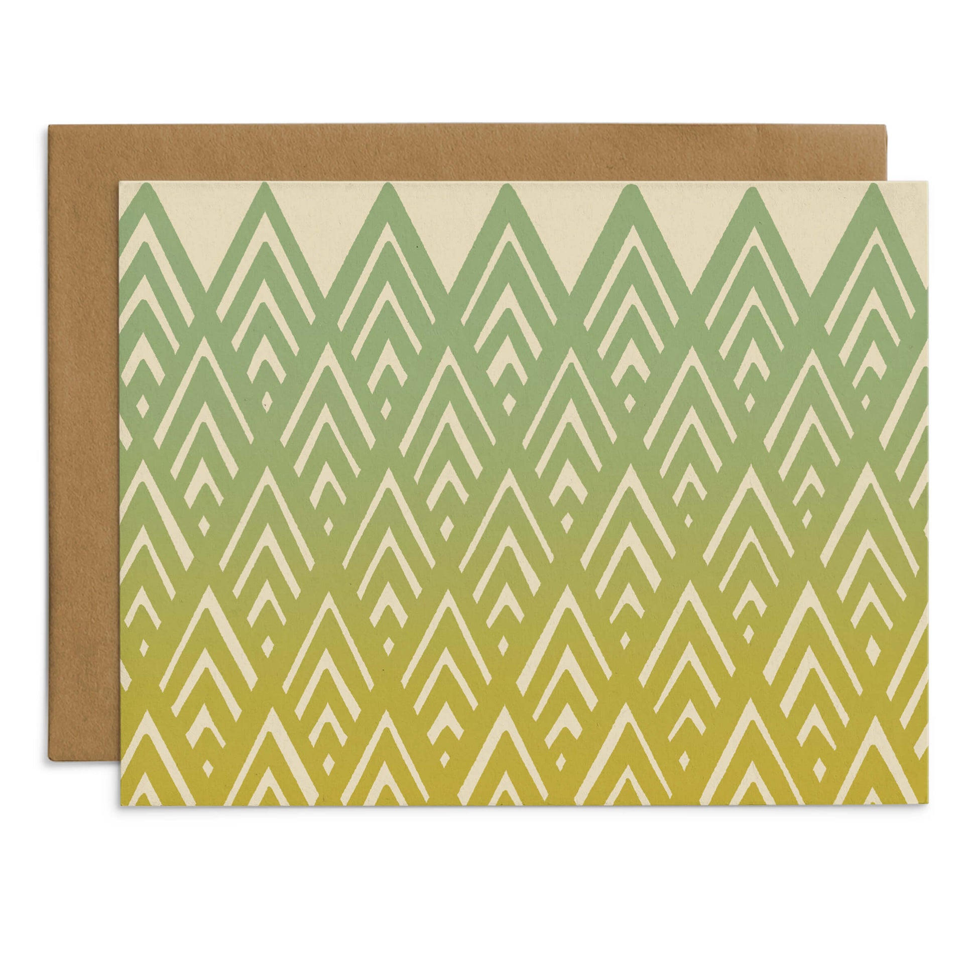 Send some mountain magic with the Green Gold Mountains Card from Starfangled Press. This delightful card showcases a playful abstract mountain design printed in a beautiful blend of green and gold shades, inspired by the verdant hills of Appalachia. With such a distinctive design, your message is guaranteed to make a lasting impression!