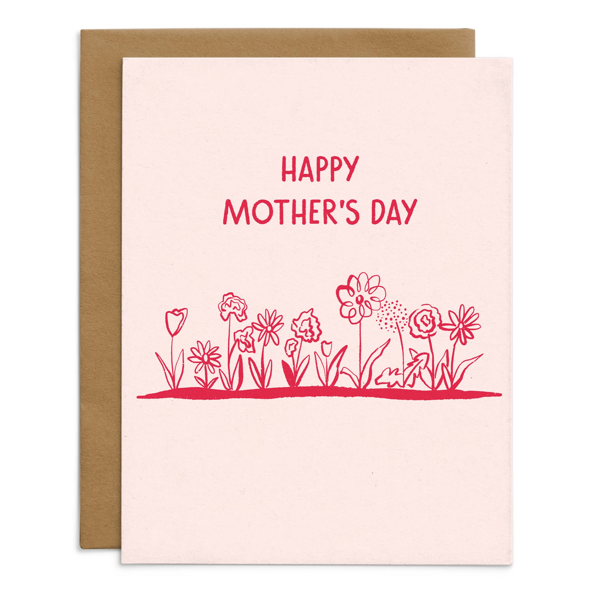 Celebrate the amazing mothers in your life with the Happy Mother's Day Flowers card from Starfangled Press! This cheerful card features a cute drawing of flowers blooming from a strip of soil, perfectly capturing the vibe of love and growth. The hand-lettered “Happy Mother’s Day” in bright red pops against the soft blush pink background, making it a fun and eye-catching choice for the occasion.