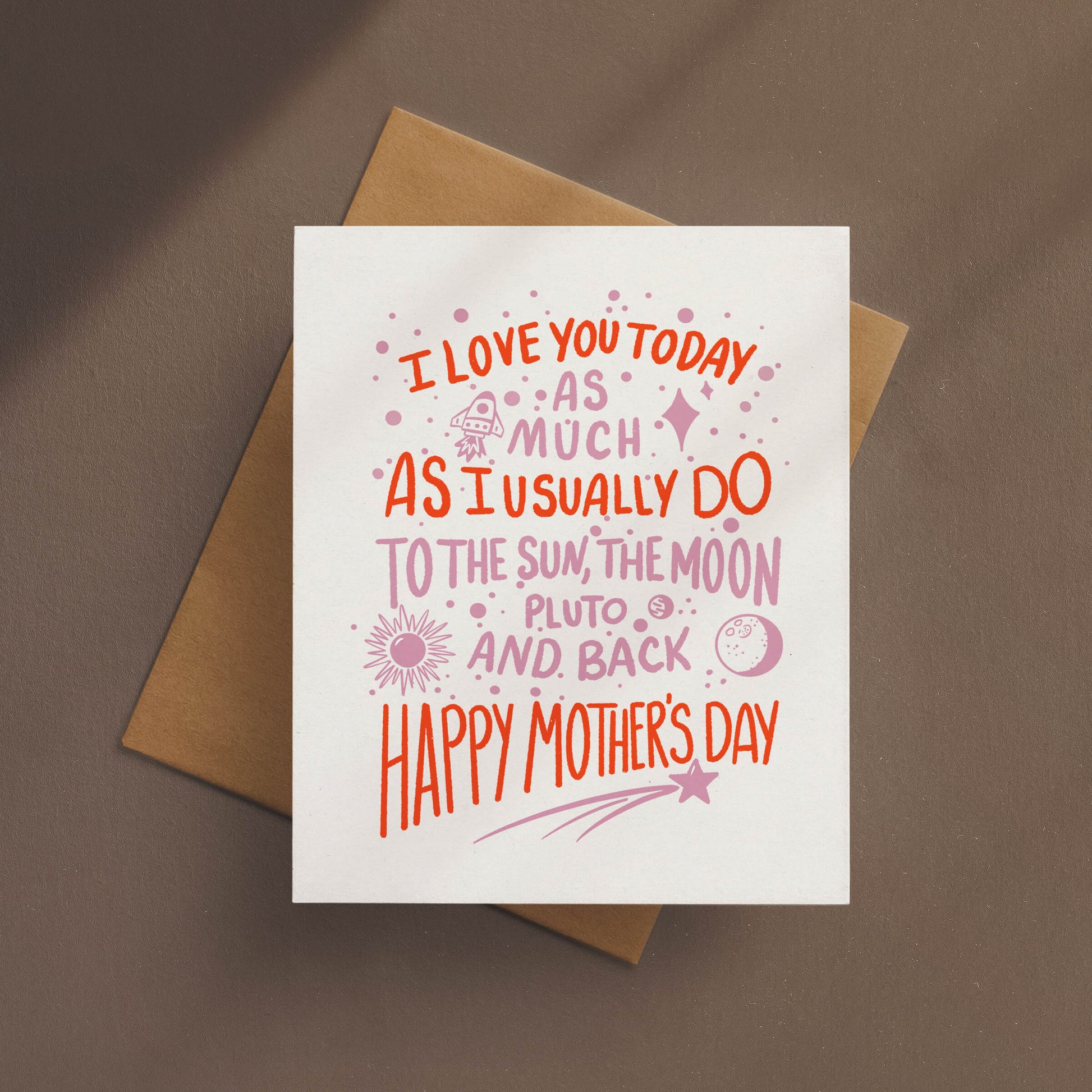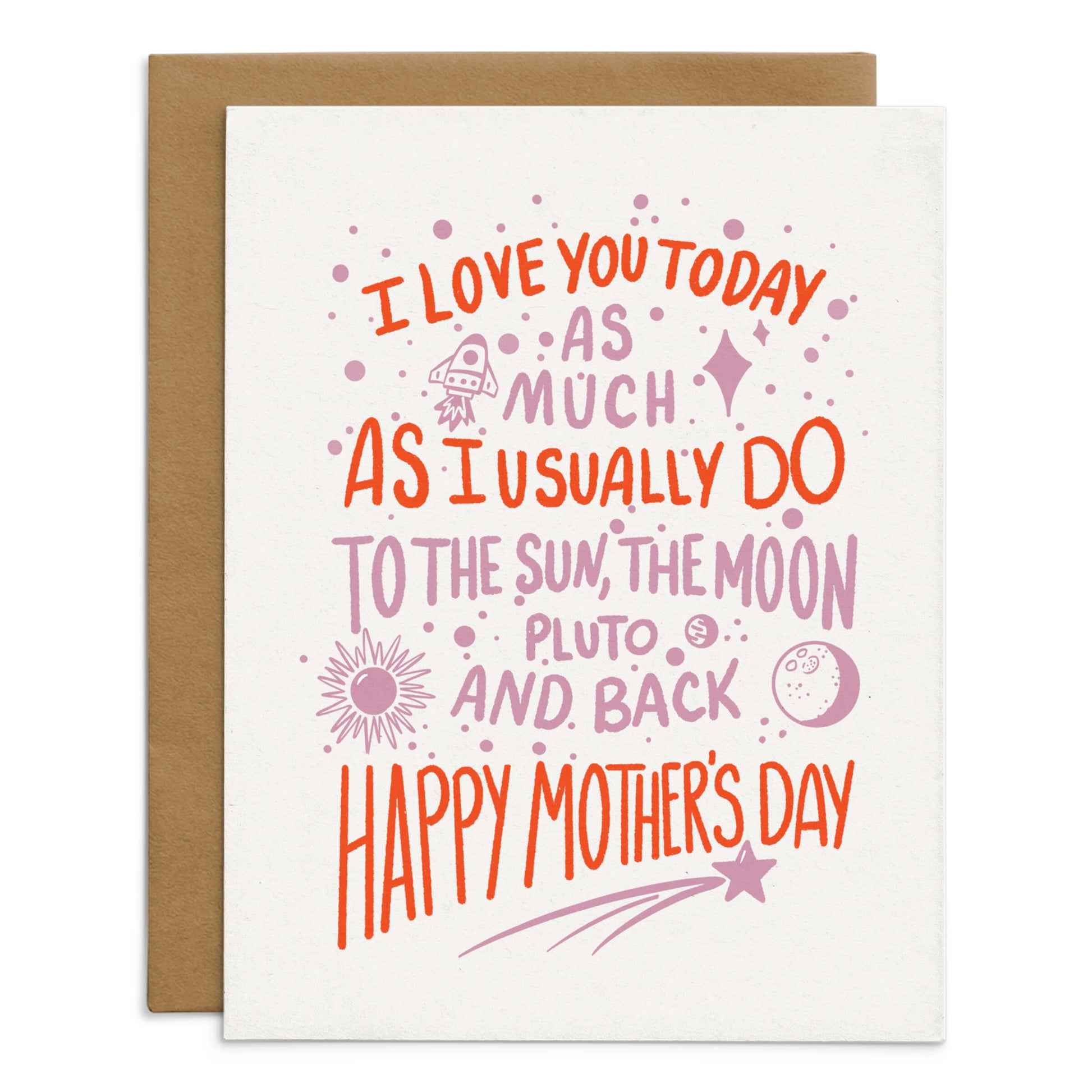Make this Mother’s Day unforgettable with the Happy Mother's Day To The Sun card from Starfangled Press! Drawing inspiration from the sweet words of a young son, this card features the adorable sentiment: “I love you today as much as I usually do, to the sun, the moon, Pluto, and back.”