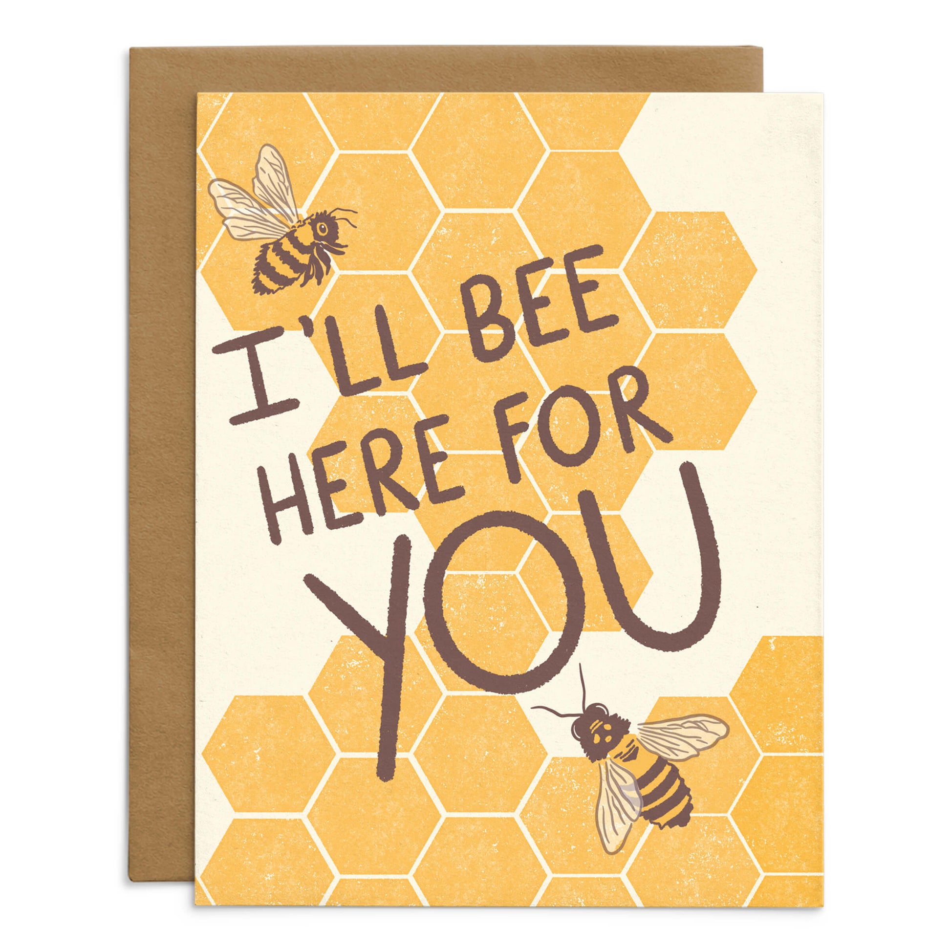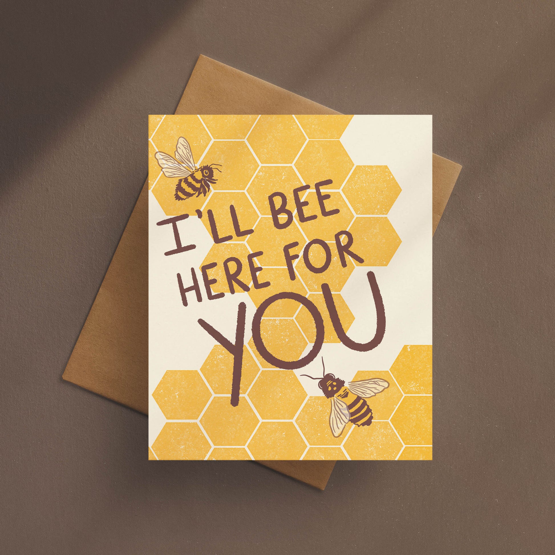 Busy bees and their honeycomb add a charming touch to the heartfelt pun "I'll bee here for you." Give the gift of comfort and reassurance with this thoughtful card.