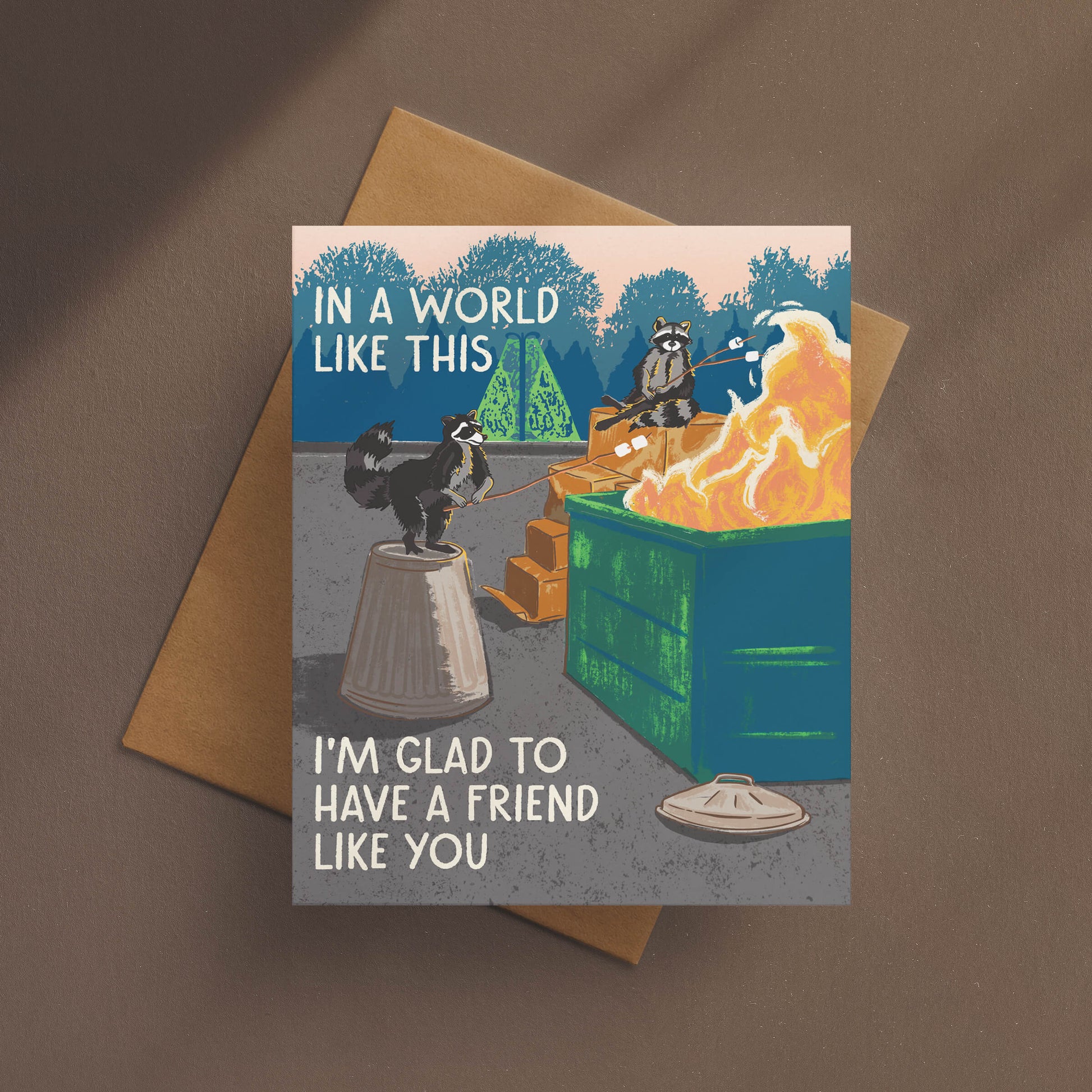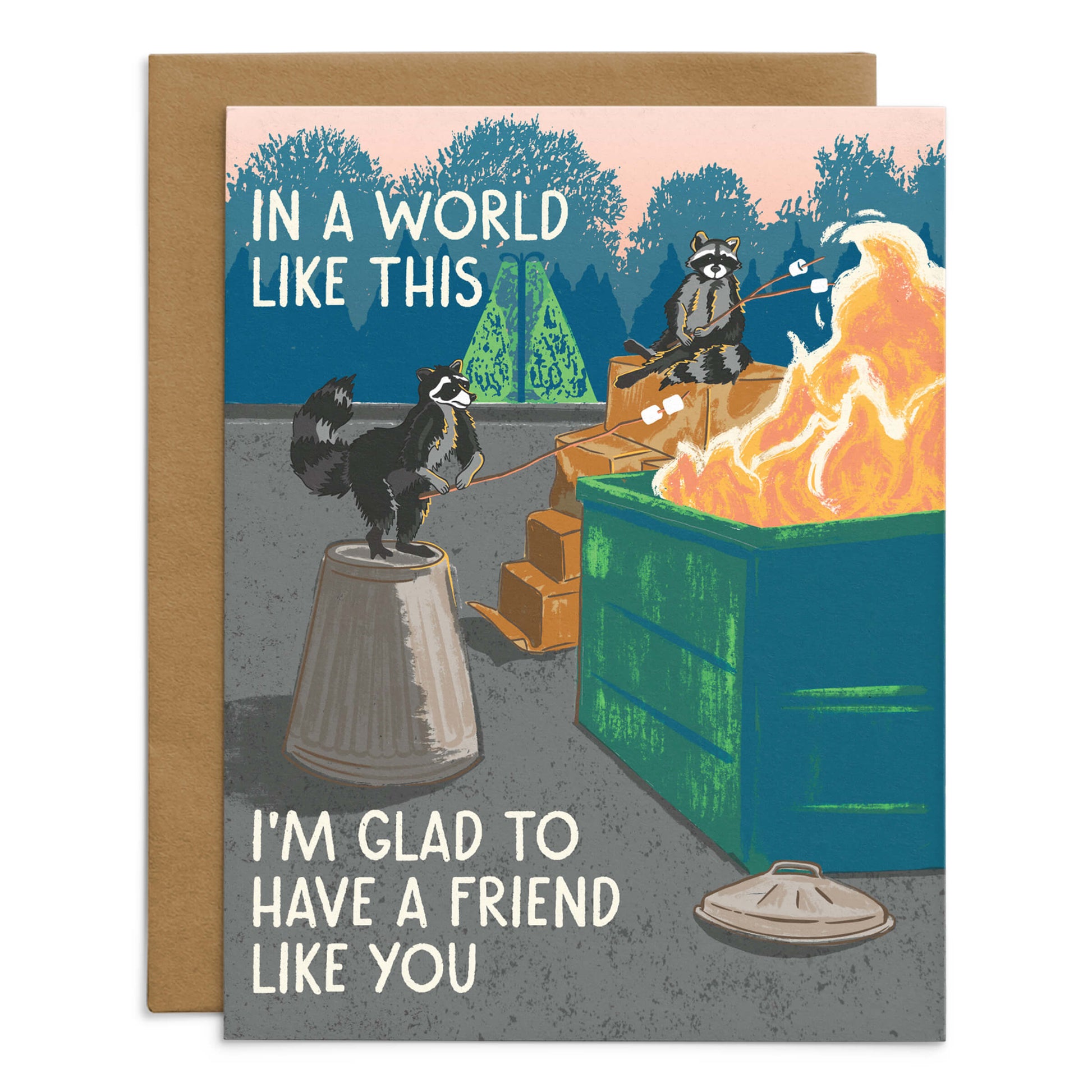 With two scrappy raccoons making the best of a messy situation and roasting marshmallows over a dumpster fire, this card is a heartfelt way to say that your friendship makes the madness not just bearable, but way more fun. 🔥