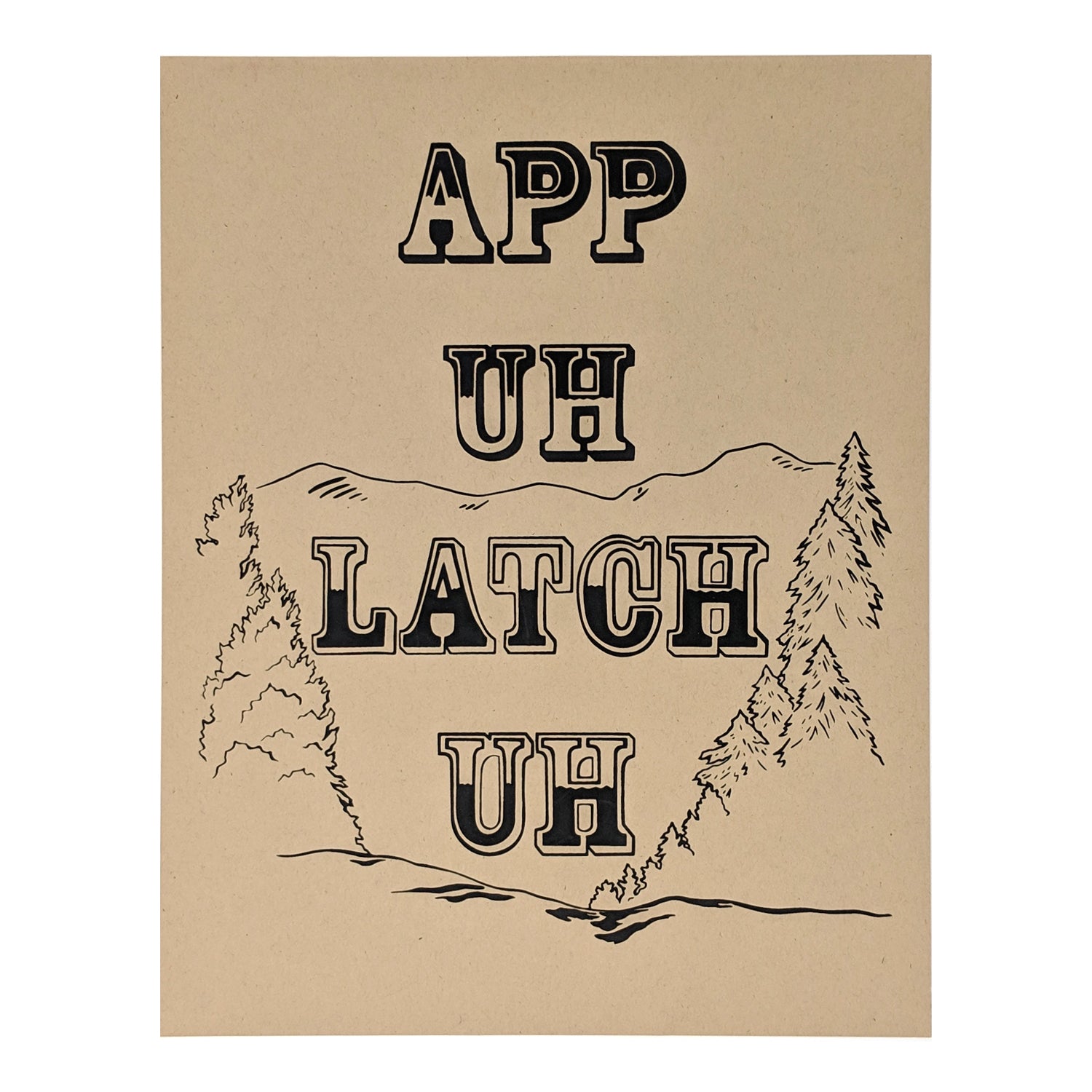This 14" x 11" screenprint incorporates the phonetic pronunciation of Appalachia in a simple line-drawn mountain landscape printed in rich, flat black ink on natural kraft paper.