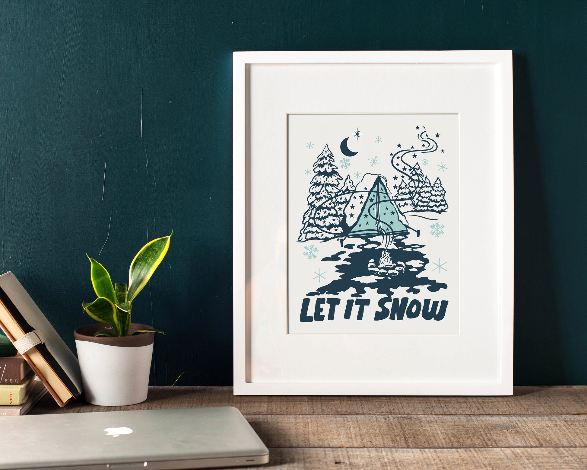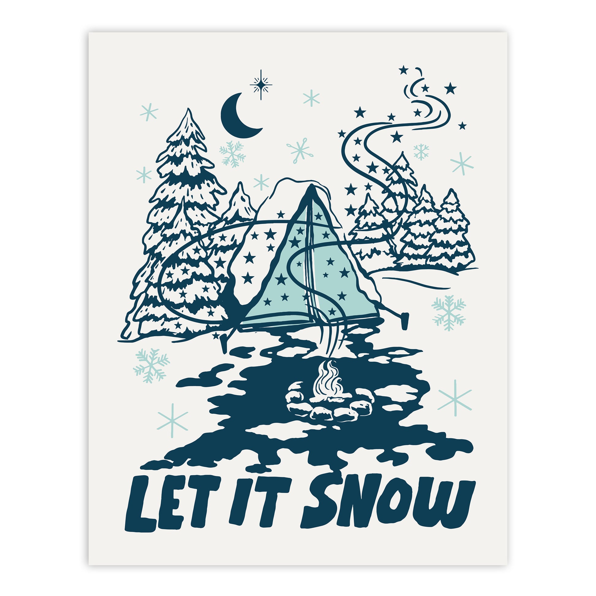 Chase the winter blues away with the Let It Snow Screenprint from Starfangled Press! Cozy up in a tent surrounded by pine trees covered in snow, with a warm campfire nearby and stars reaching up to the night sky. Snowflakes fall lightly while snow melts away from the warm ground around the campfire, creating a snuggly winter vibe. With dusty mountain blue inks and hand lettering that reads “Let It Snow” this original screenprint is sure to give your winter décor the perfect playful touch and bring a bit of outdoor adventure into your home all winter long. Get ready to embrace the chilly season!