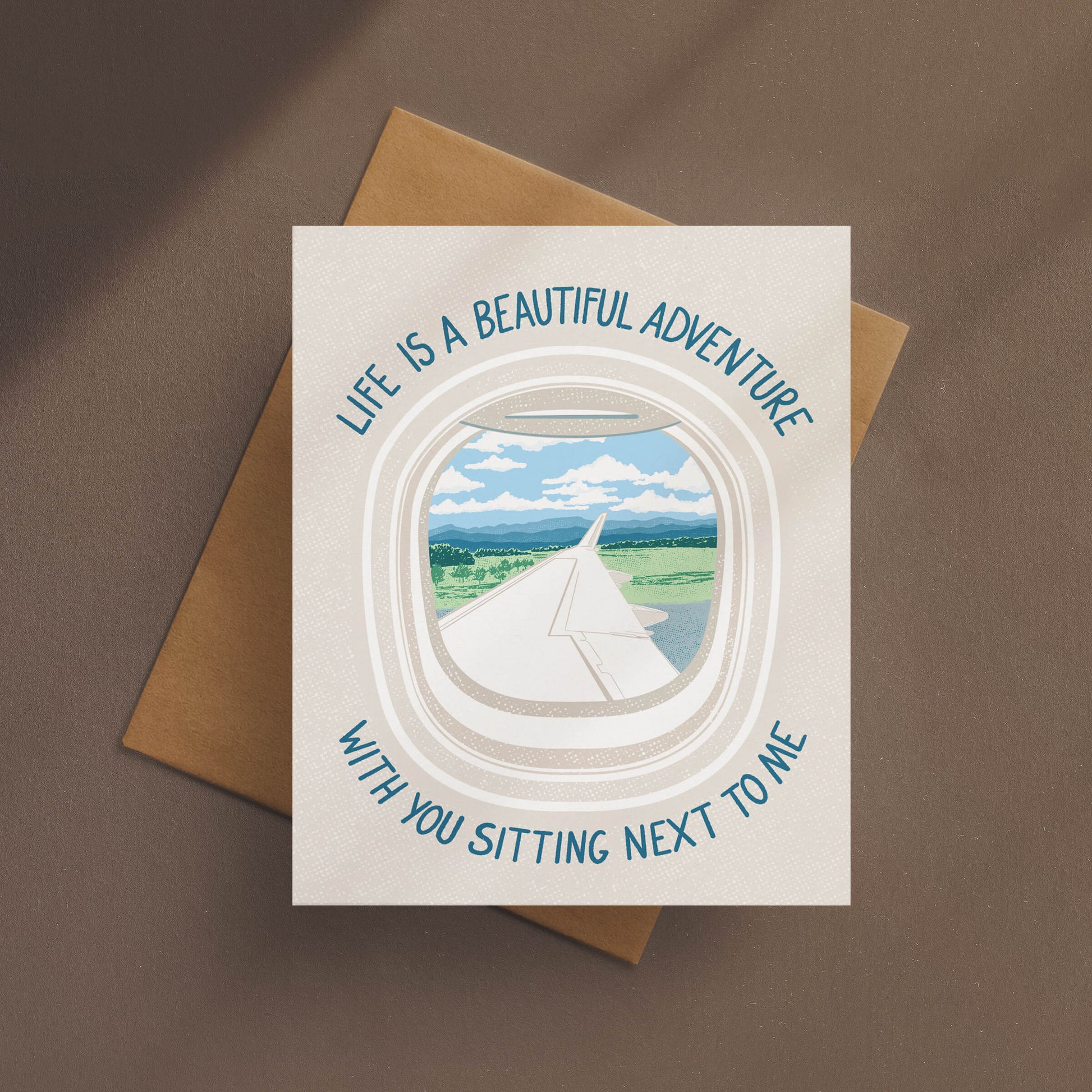 Illustrated with a charming mountain landscape as seen from an airplane window, its heartfelt expression tells them how much their presence means to all of your adventures.