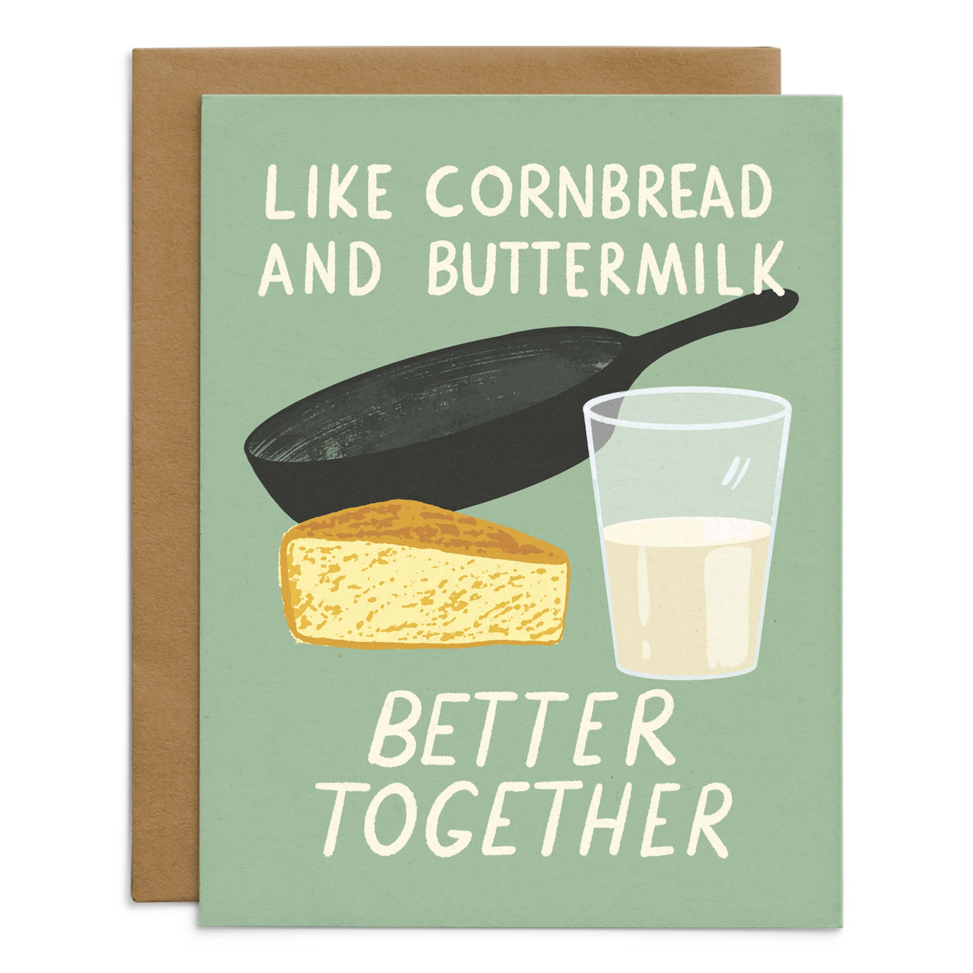 Perfect for your better half or your best friend, this quirky greeting card shows that some things just go better together - like a cast iron skillet, cornbread, and a glass of cold buttermilk. A match made in deliciousness!