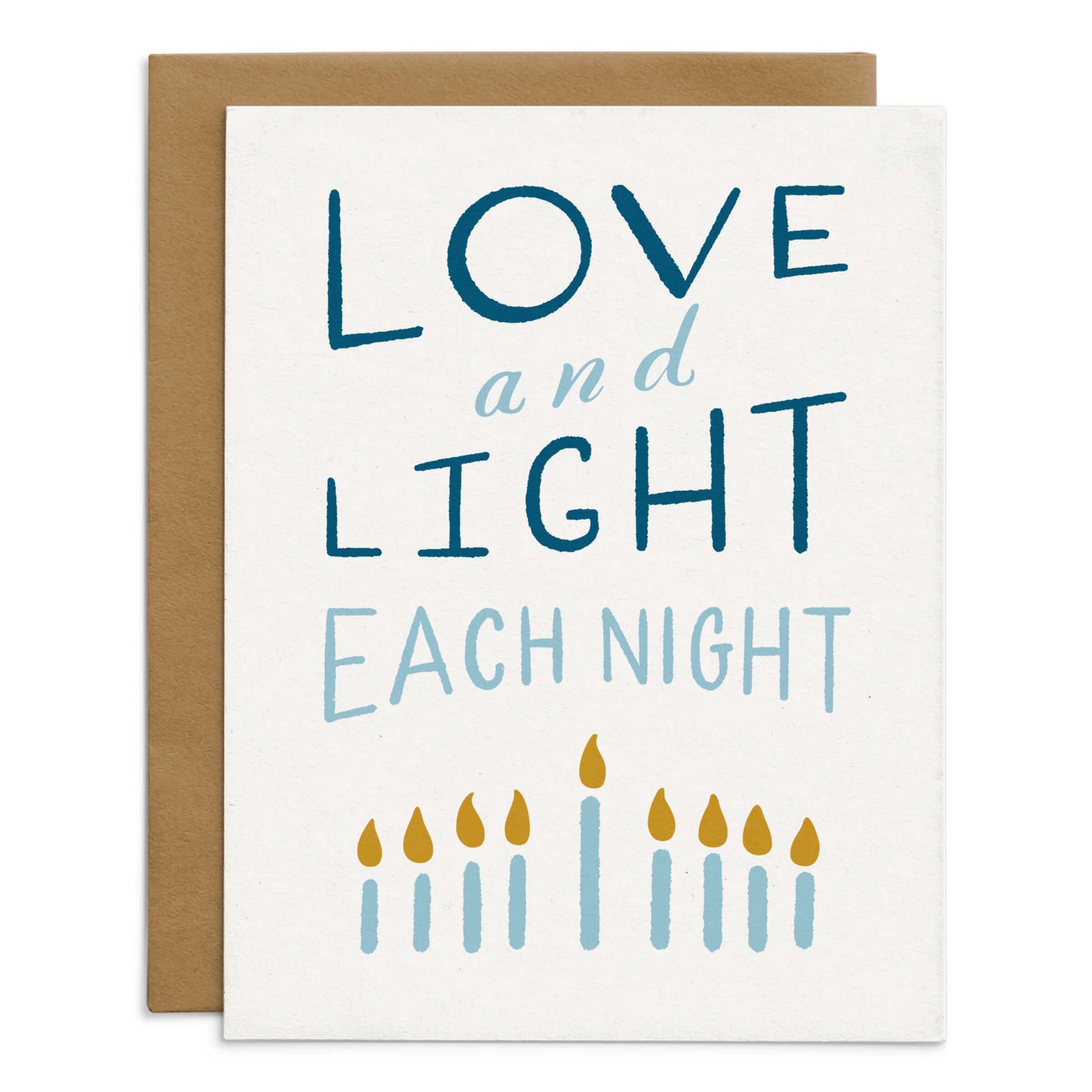Celebrate the beauty of Hanukkah with this radiant Love and Light Each Night Hanukkah Card from Starfangled Press. Simple blue lettering and golden candle flames on soft white paper set the tone for a season filled with warmth, meaning, and connection. Thoughtful without being fussy, this card serves as a gentle nudge to find beauty in the everyday moments and to cherish the things that matter most. It's a delightful and uplifting way to remind your loved ones what's most important this holiday season!✨