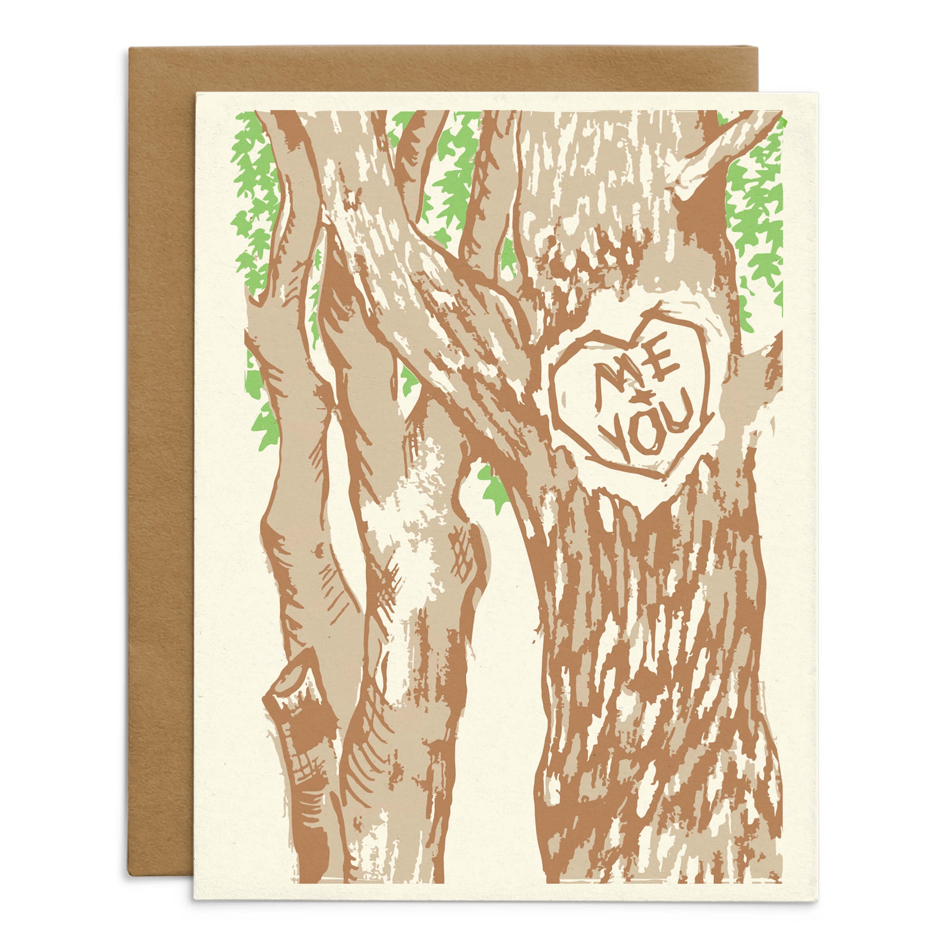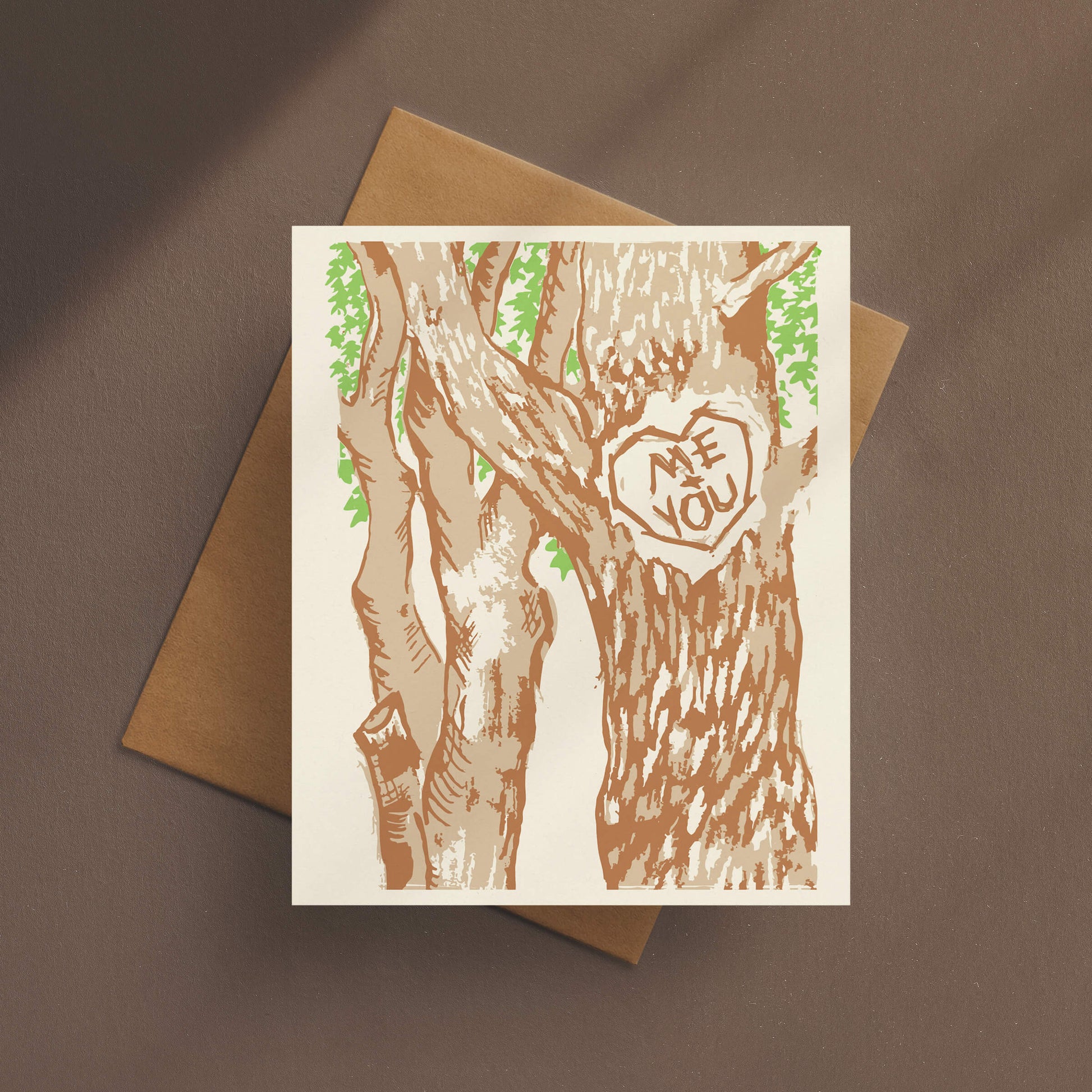 Let the Me + You greeting card from Starfangled Press be a sweet reminder of your love. This tender design features an image of a tree trunk with a classic heart engraving, spelling out "Me + You" inside. Whether you're celebrating an anniversary, Valentine's Day, or just want to send a little love note, this card is the perfect way to show your affection.
