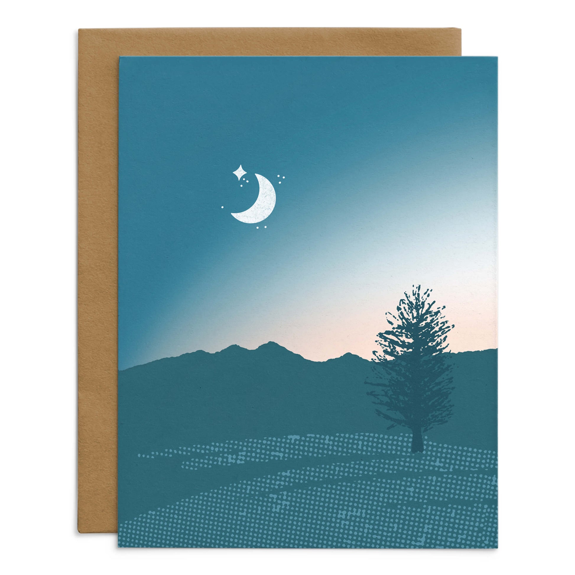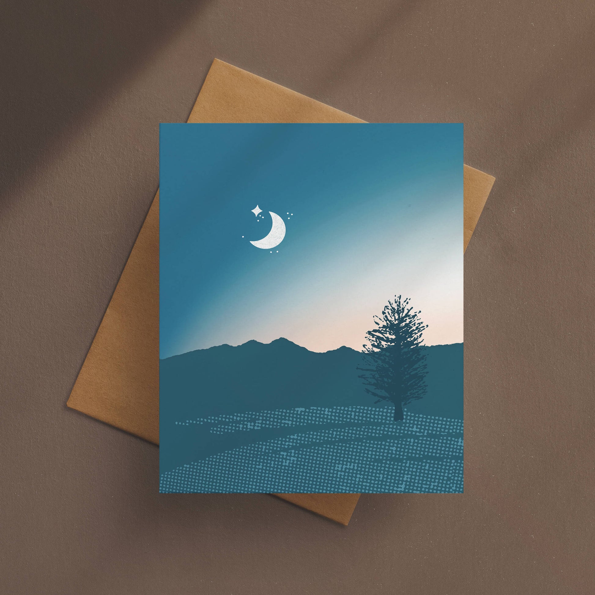 Brighten their day with the celestial charm of the Moonrise Card from Starfangled Press. Featuring a serene landscape with a rising moon and a single silhouetted tree against a blue mountain backdrop, this dreamy card is the perfect way to send your warm wishes for any occasion.