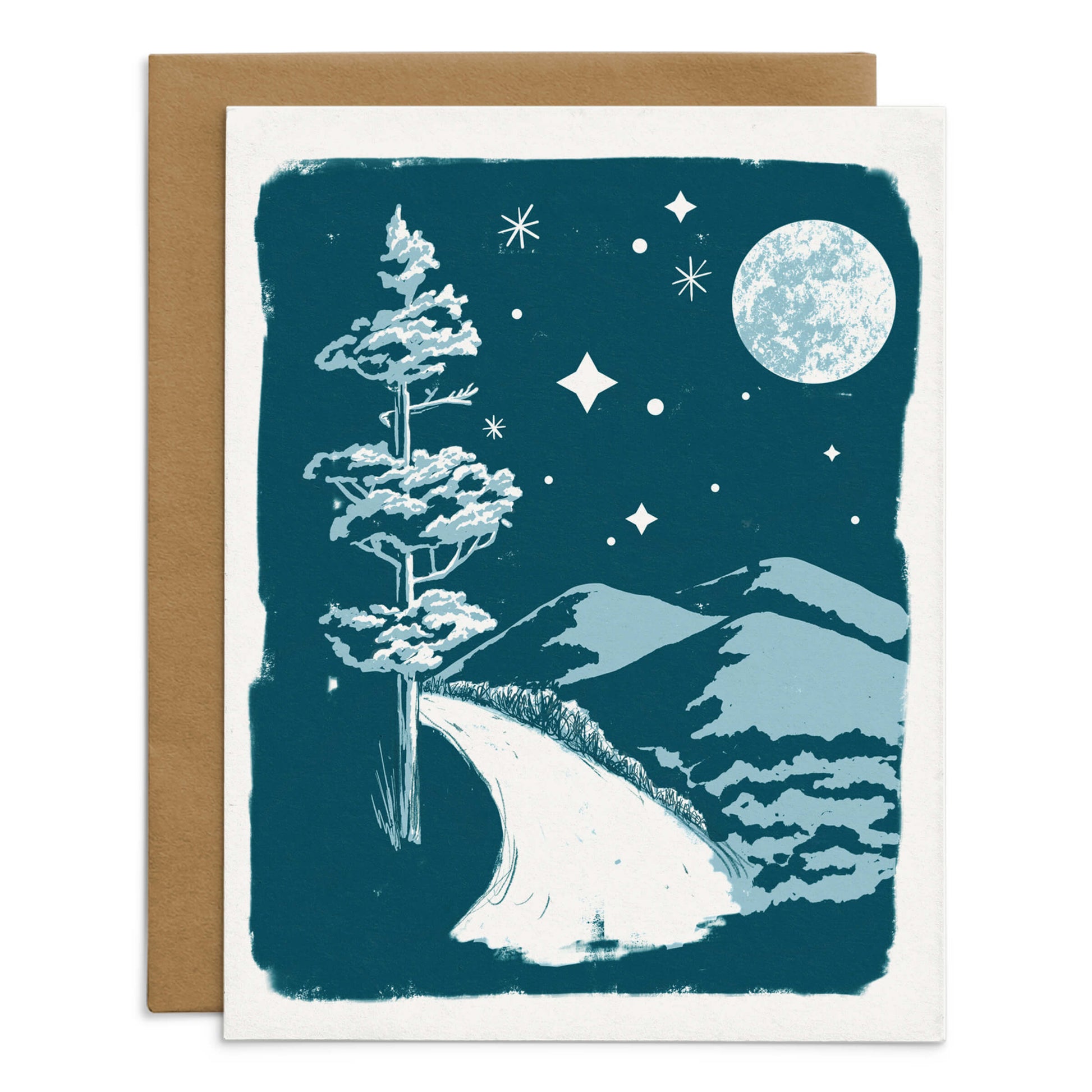 Take the scenic route and get lost in the beauty of the evening with the Mountain Parkway at Night card from Starfangled Press! This beautifully illustrated card, printed in soft dusty blues, captures the peaceful allure of a winding mountain road under the soft glow of a full moon and twinkling stars.