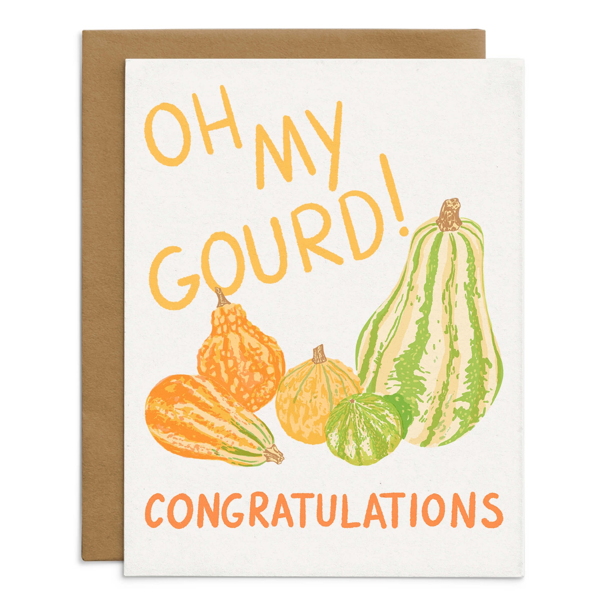 Say congratulations with the quirky Oh My Gourd card from Starfanlged Press! Featuring a pun-tastic "oh my gourd!" message and adorable gourd illustration, this card is perfect for any occasion. Silly and playful, it's sure to bring a smile to anyone's face! Oh my gourd, it's the best card ever! (ok, we’ll stop with the puns now)