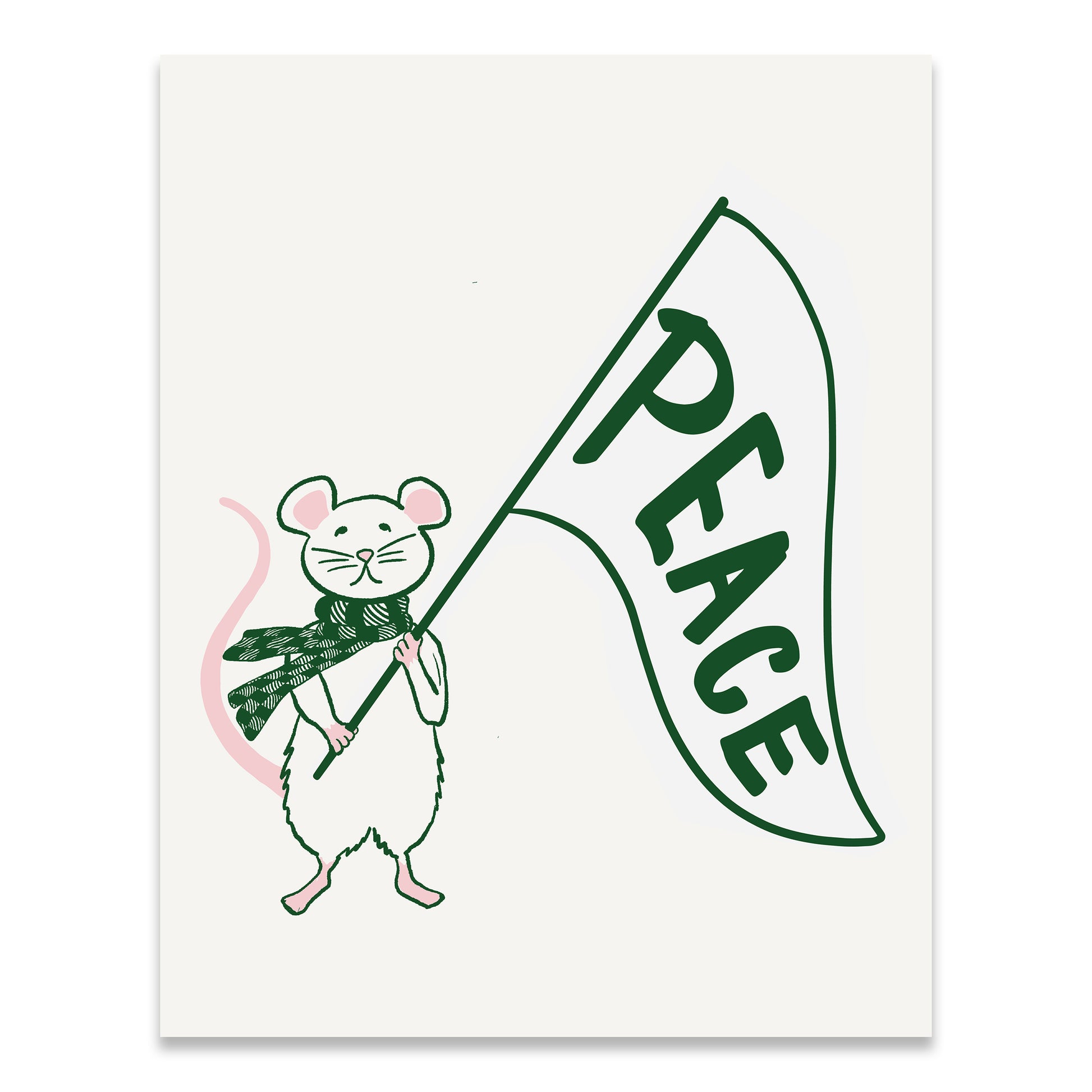 Make a stand for Peace and a bold statement with this adorable Peace Mouse Screenprint from Starfangled Press! This brave white mouse stands up in silent protest wearing a cozy winter scarf and holding an extra large flag with the hand-lettered word "PEACE". A perfect reminder of kindness and inclusion, this little fella will inspire you to speak up and spread the message of peace in the sweetest way possible!