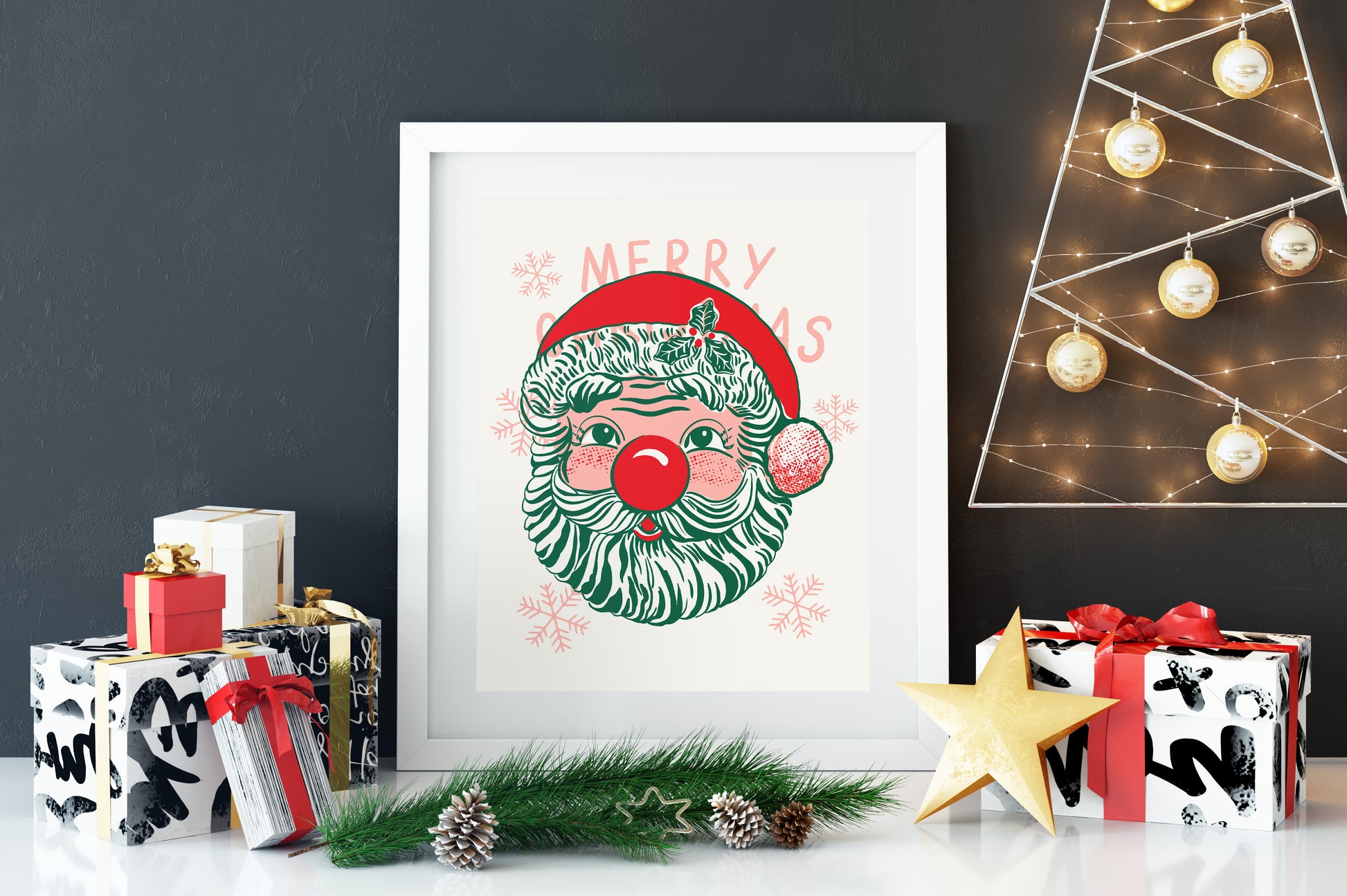 Rejoice in the holiday cheer with this charming Retro Santa Claus original screenprint from Starfangled Press. This whimsical design pays homage to a beloved childhood decoration of a plastic Santa face with a bouncy red nose that plays a delightful light show! 🎅 Add a jolly touch to your yuletide décor with this fun screenprinted design on soft white paper with bright pink, red, and green inks.