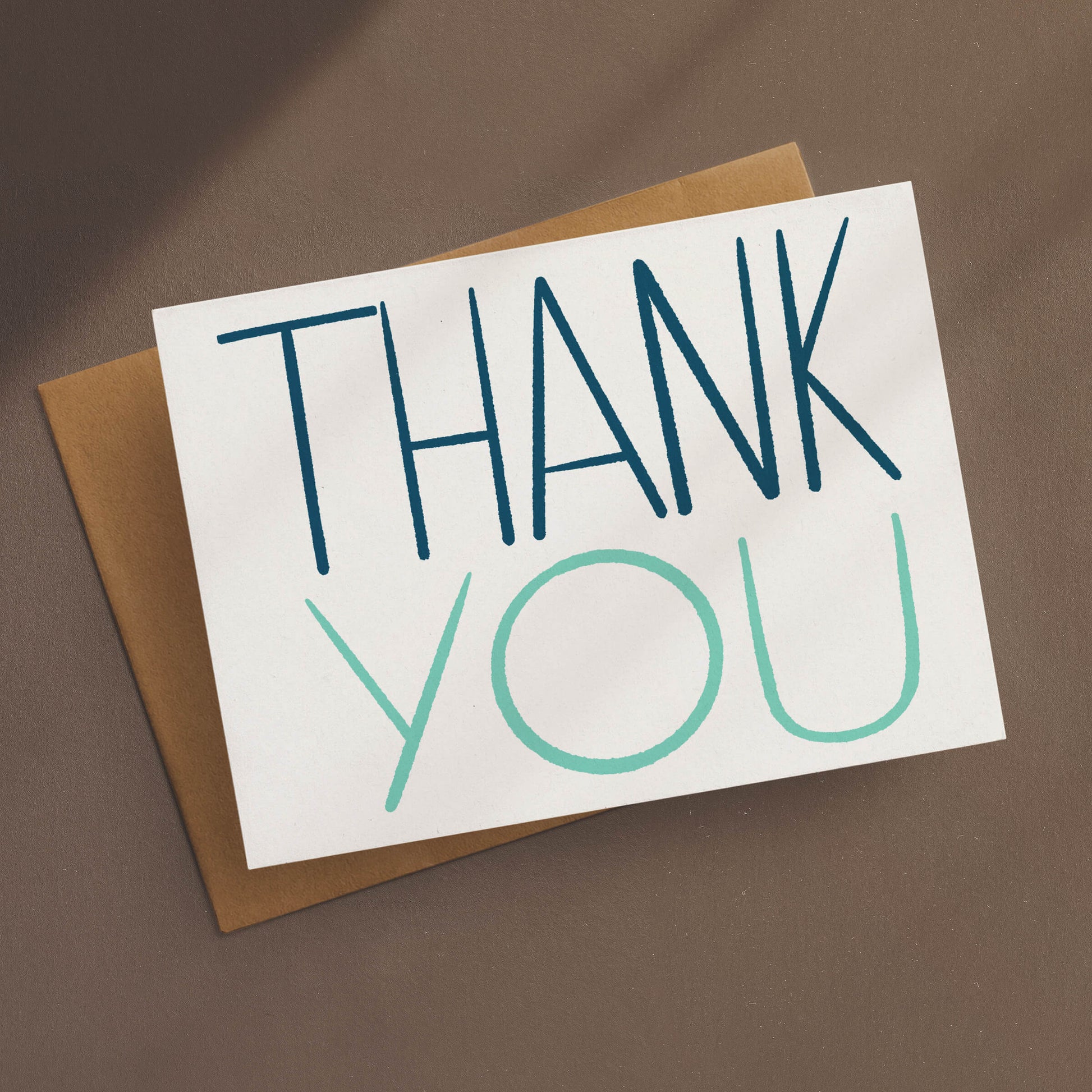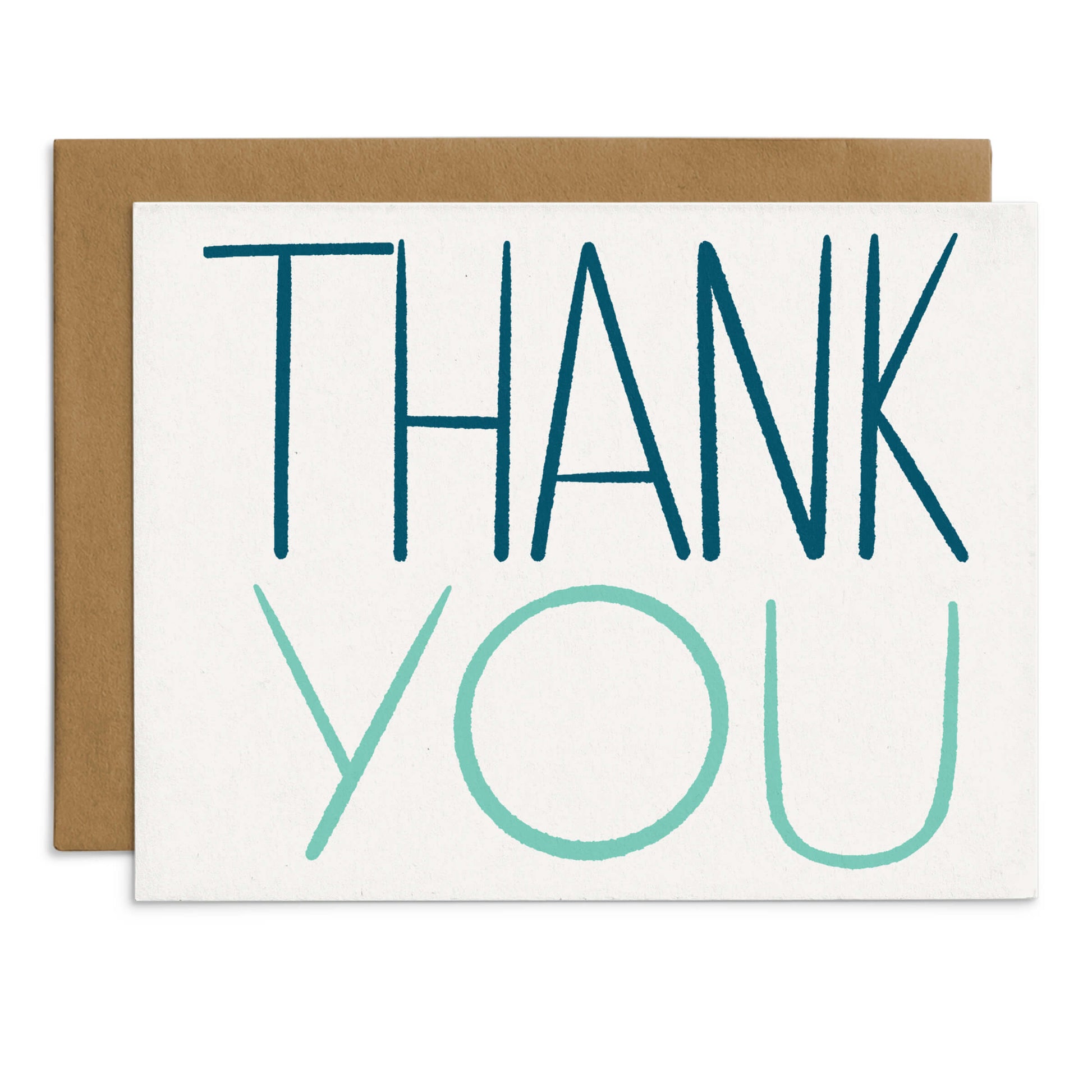 Show your gratitude with the Simple Thank You card from Starfangled Press. Featuring the words "Thank You" in casual handwritten letters, this minimalist card uses a subtle color palette of dark blue and aqua blue on soft white paper.