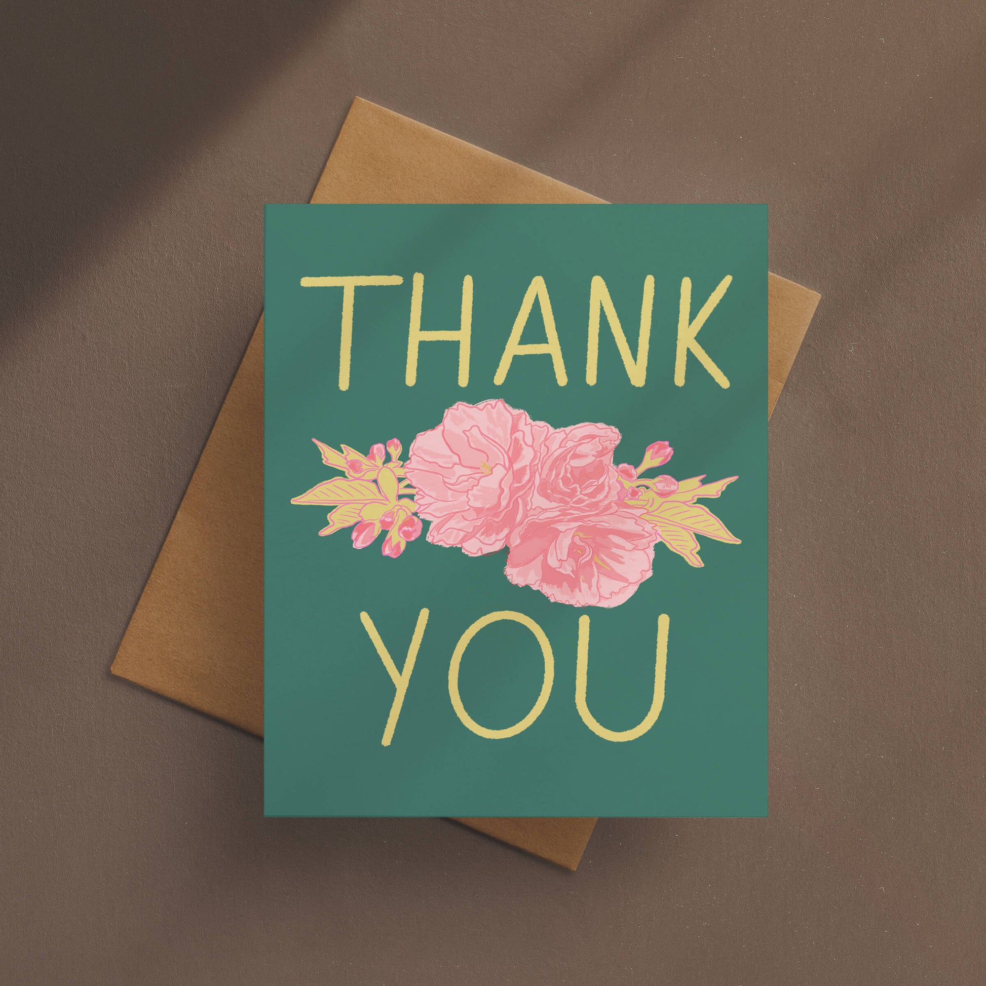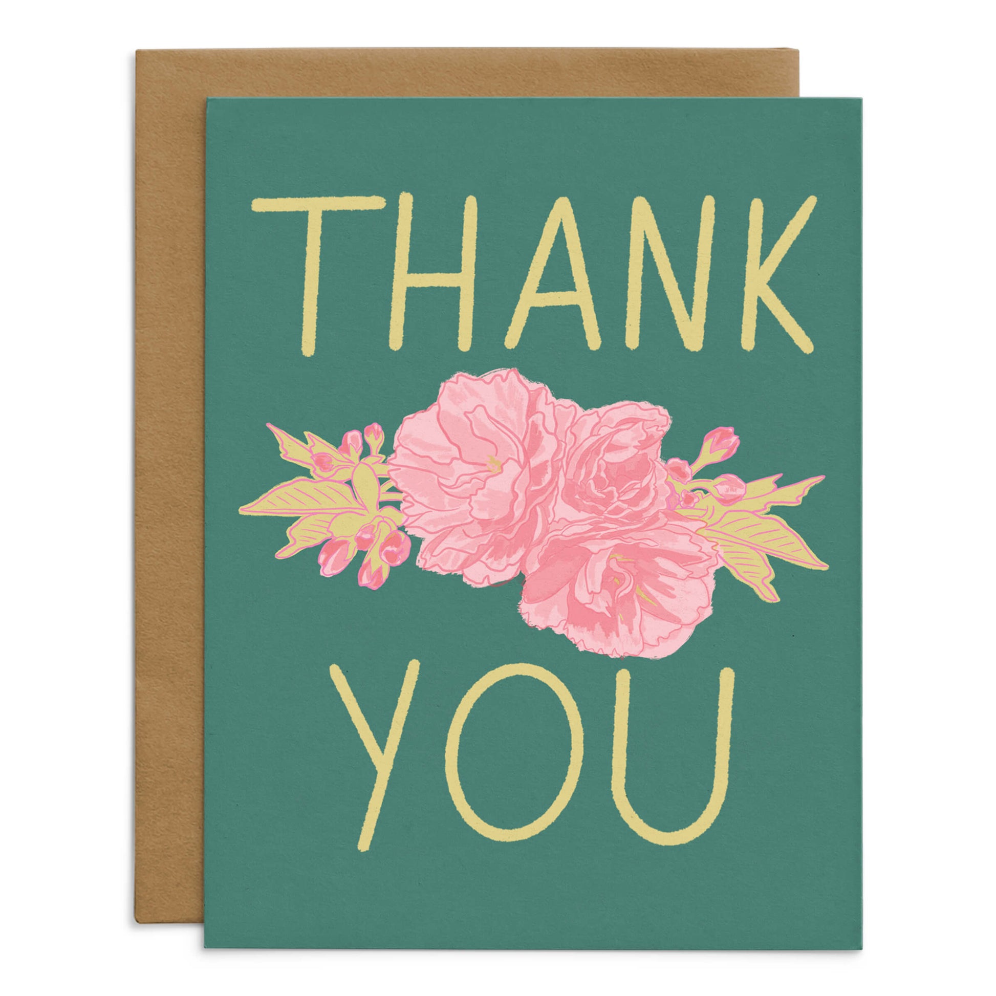 Express your gratitude with the Thank You Cherry Blossoms card from Starfangled Press. This hand-lettered greeting card features the beautiful blooms of a double-blossom cherry tree on a dark green background. The casual "thank you" exudes a playful vibe, perfect for showing your appreciation in a unique and charming way!