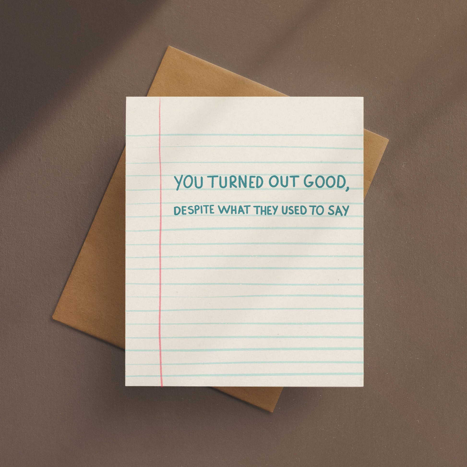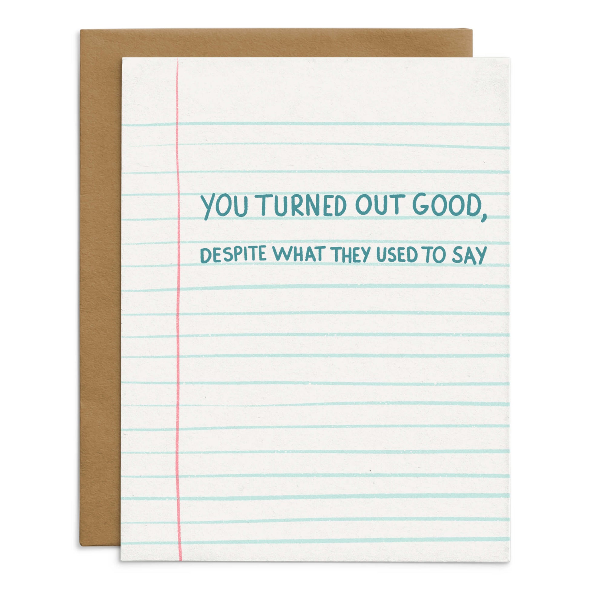 Share some love and laughs with the You Turned Out Good card from Starfangled Press!