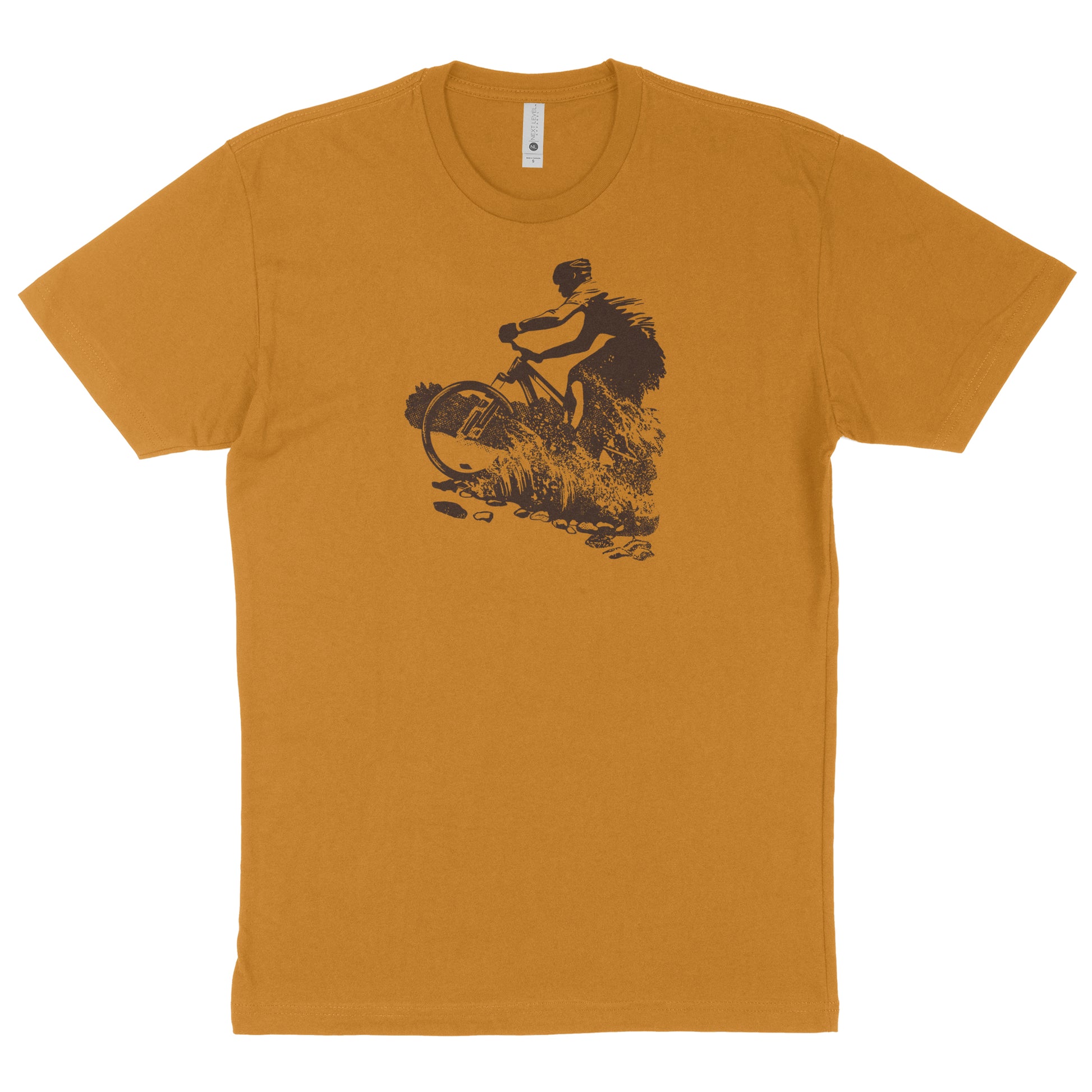 Hit the trails in style with the Water Crossing Mountain Bike Crew Neck T-Shirt from Starfangled Press! This 100% cotton antique gold t-shirt has an original hand-printed design featuring a mountain biker powering through rushing water and rocky terrain.