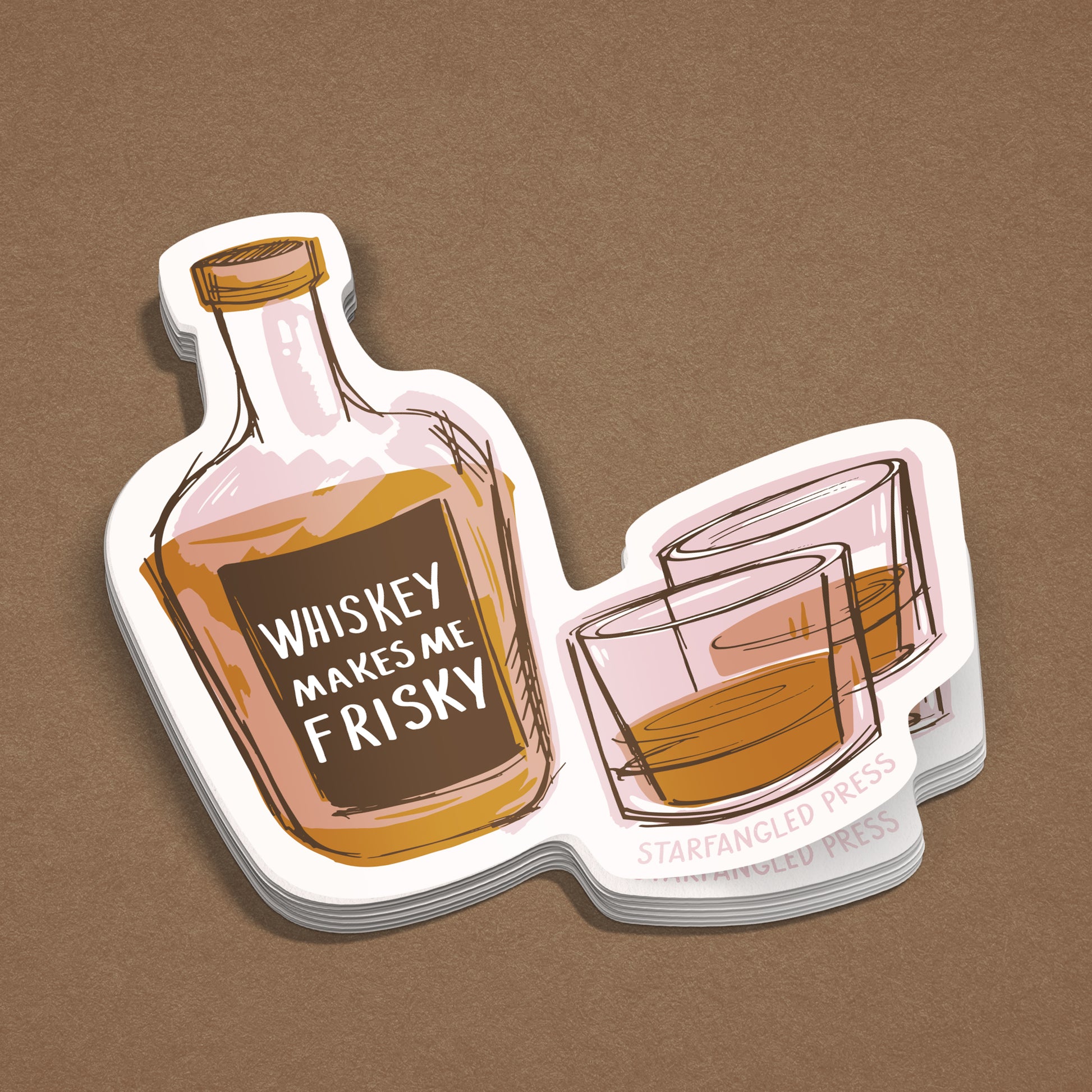This design uses a quick and casual illustration style with soft white hand-lettered text on the chocolate brown label of a bottle filled with the soft amber browns of a good whiskey and combined with the lavender-hued glass of the artist's favorite drinkware, all on a soft white background. This sticker is 2.95" x 3" in size.