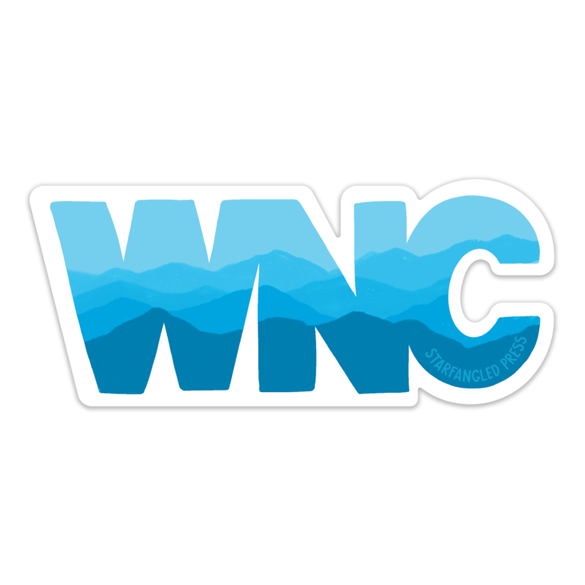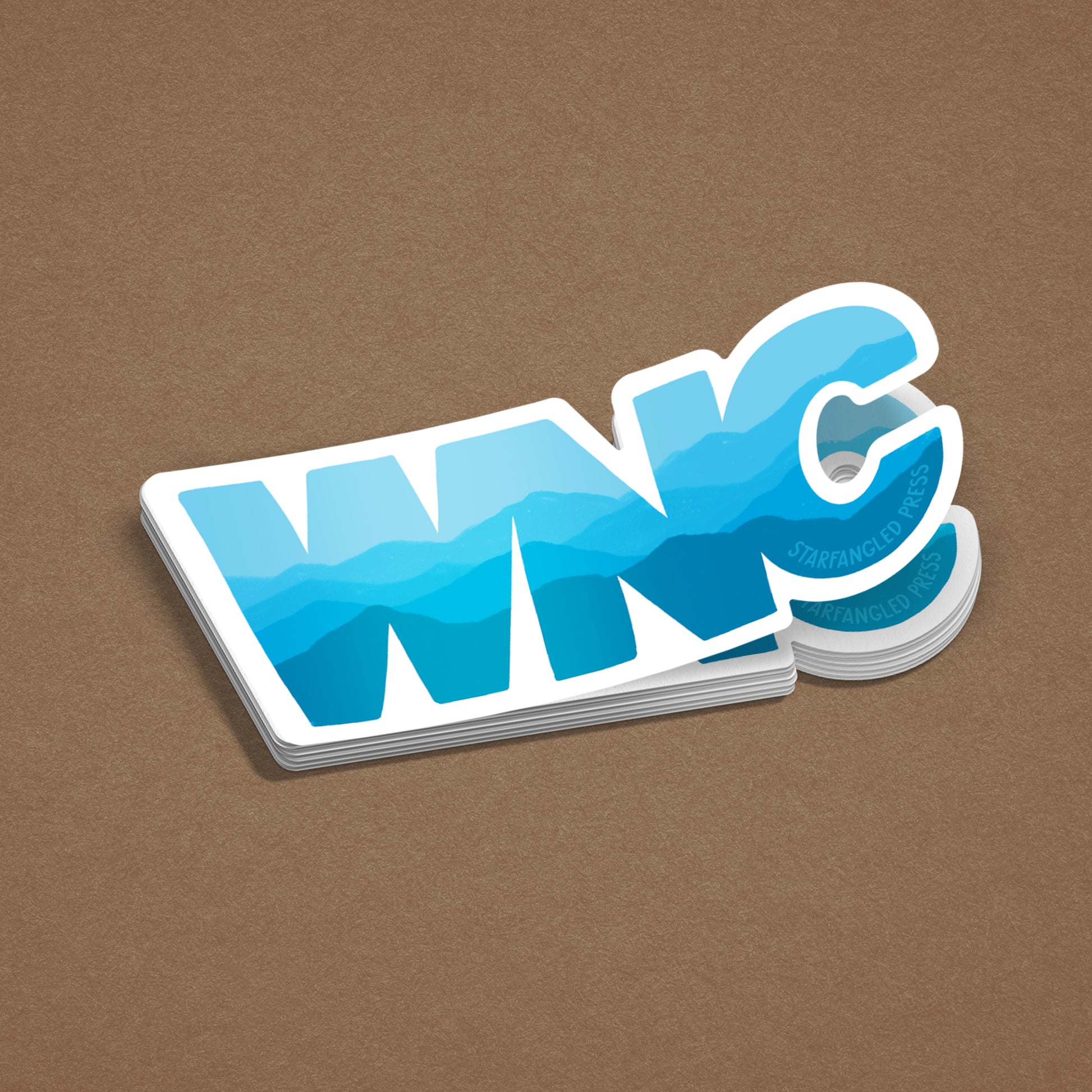 A WNC, or Western North Carolina, sticker inspired by the beautiful Blue Ridge Mountains that cover most of the western part of the state of North Carolina, including the city of Asheville and our home in Brevard.