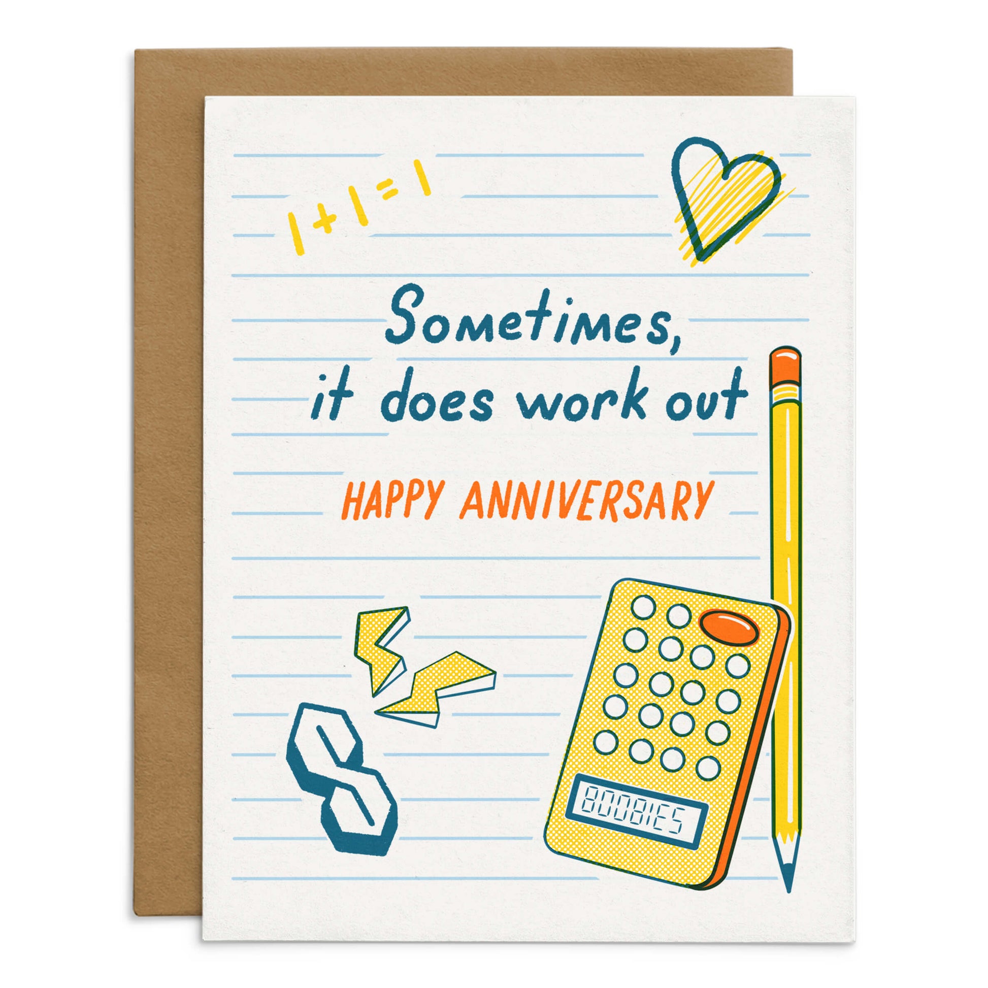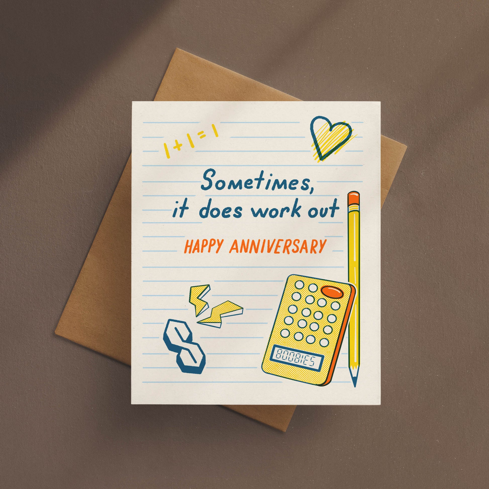 This quirky Sometimes It Does Work Out anniversary card from Starfangled Press is full of nostalgic humor from the of late 1990’s and early aughts. With a notebook page design filled with that “S,” a heart, lightning bolts, dirty jokes on the calculator, and a pencil (for all your “write” moves).
