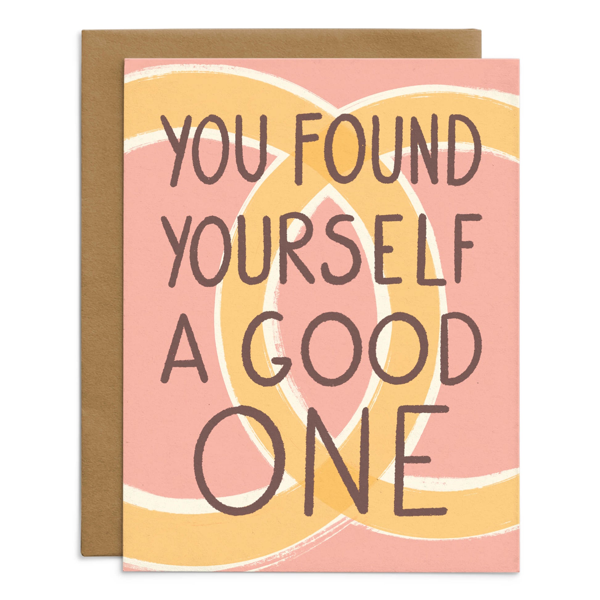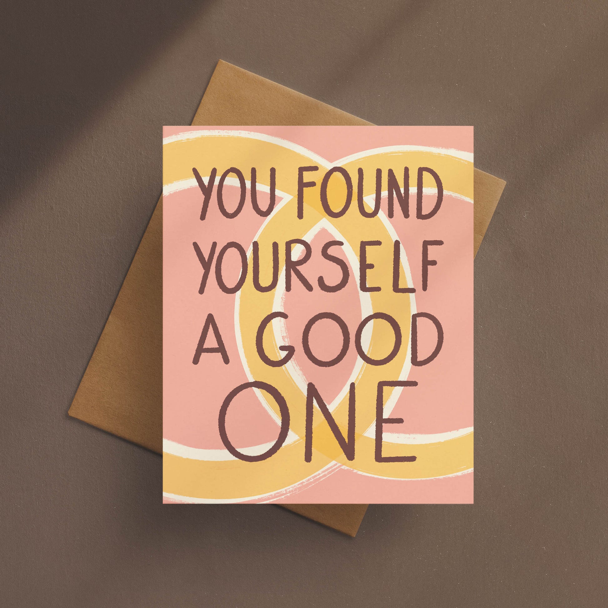 Featuring two interlocking wedding rings and the words "you found yourself a good one," this card is perfect for weddings, engagements, and anniversaries.